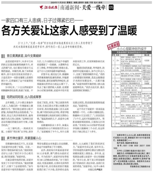 “关爱一线牵”是集团创建10多年的慈善品牌,为贫困户和社会公益力量之间搭起爱心桥梁,2024年共助力贫困家庭实现微心愿近百起,彰显了党报的品牌影响力,曾连续两届荣获“江苏省公益慈善宣传合作奖”,获南通市第36次文明新风典型、南通市政府慈善奖,还被江苏省人民政府特授予“江苏慈善奖”最具影响力慈善项目。