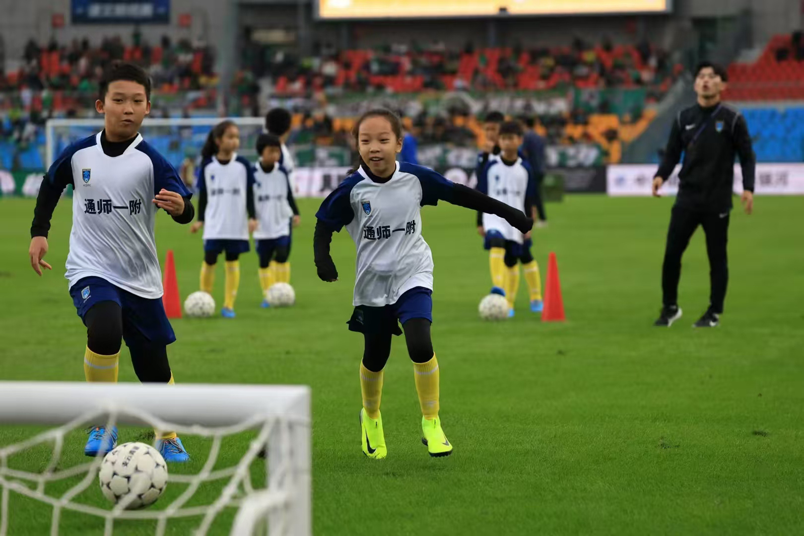 据了解,自2018年将足球确定为“一校一品”特色项目以来,通师一附平均每周开展2至3场比赛,累计开展500多场校园比赛。这样的绿茵热情遍及全区。目前,全区37所小学“校校有足球,班班有球队”,超过半数学校被评为“全国青少年校园足球特色学校”。根据不同年龄,各校推出“游戏化—趣味化—技能化”三段式课程,让孩子们从接触、喜欢到擅长,一步步走进足球世界。