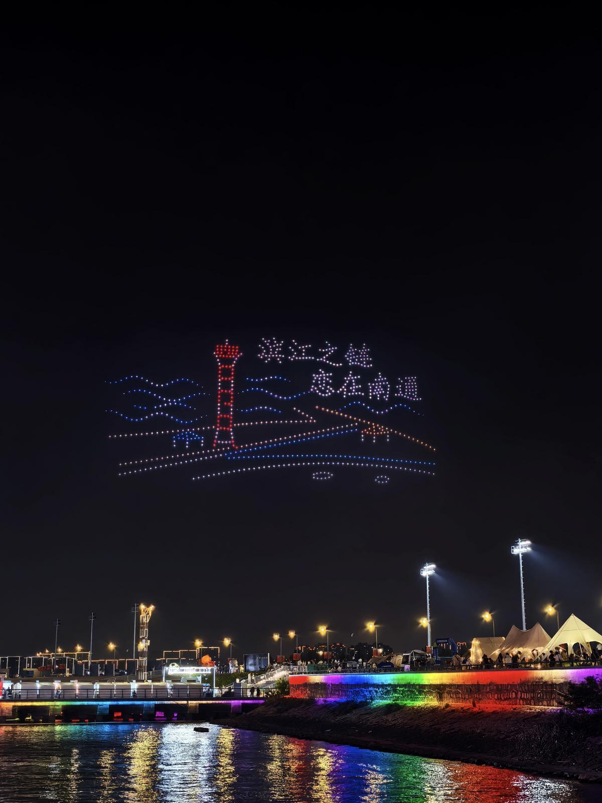 夜幕降临,千架无人机在滨江上空组成各种图案,时而化作南通地标建筑,时而呈现祝福字样,梦幻光影点亮了整个滨江夜空。记者漫步滨江岸线,看到不少游客欣赏着江景,享受着难得的悠闲时光。从上海来的张天帅一家正坐在折叠椅上喝着精酿啤酒,看着江面上往来的船只,“我们是第一次来南通,这里的滨江太美了,既有科技感的活动,又有自然唯美的江景,很适合全家出游。”