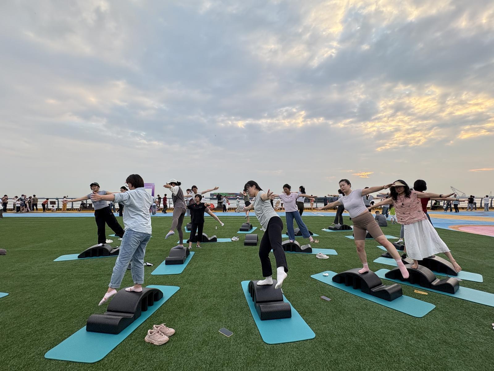 江风轻拂,晚霞为背景,在一片绿意盎然的草坪上,数十位瑜伽爱好者正在专业老师的指导下,借助弧形瑜伽辅助器械舒展身体。瑜伽爱好者杨梅告诉记者:“江风、绿草、晚霞,让我们的身心都得到了极大的放松,这种体验太特别了。”