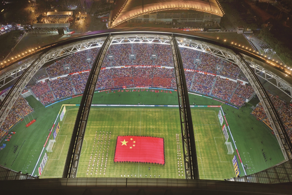护旗手队伍手举巨幅国旗步入球场。 记者许丛军