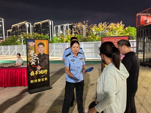 10月7日晚上,启东市公安局汇龙镇派出所巧借曹云金《携手同行》听云轩相声专场启东站演出的“人气东风”,在蝶湖公园活动现场同步开展反诈宣传活动,让欢声笑语与安全警示同频共振。