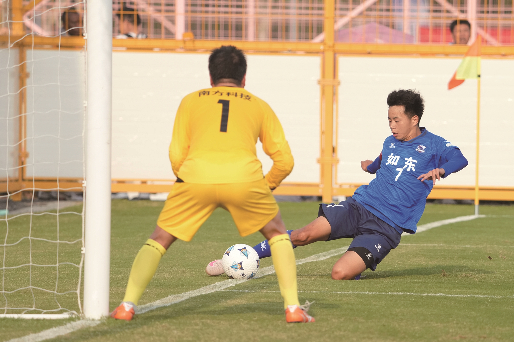 海门队与南通开发区队的比拼在四号球场点燃战火。第18分钟,南通开发区队3号范文韬乌龙球,海门队1∶0领先;第28分钟,海门队20号张浩楠进球;第37分钟和第46分钟,海门队21号郭凯楠再入两球,海门队4∶0领先;第53分钟,29号董帅再进一球。终场哨响,海门队5∶0大胜南通开发区队。