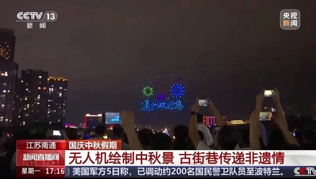10月6日央视新闻频道报道双节期间通州各具特色的文旅表演。其中,无人机灯光秀和石港古镇非遗集市等特色活动得到重点报道,展现了通州文旅融合的创新成果与地域魅力。