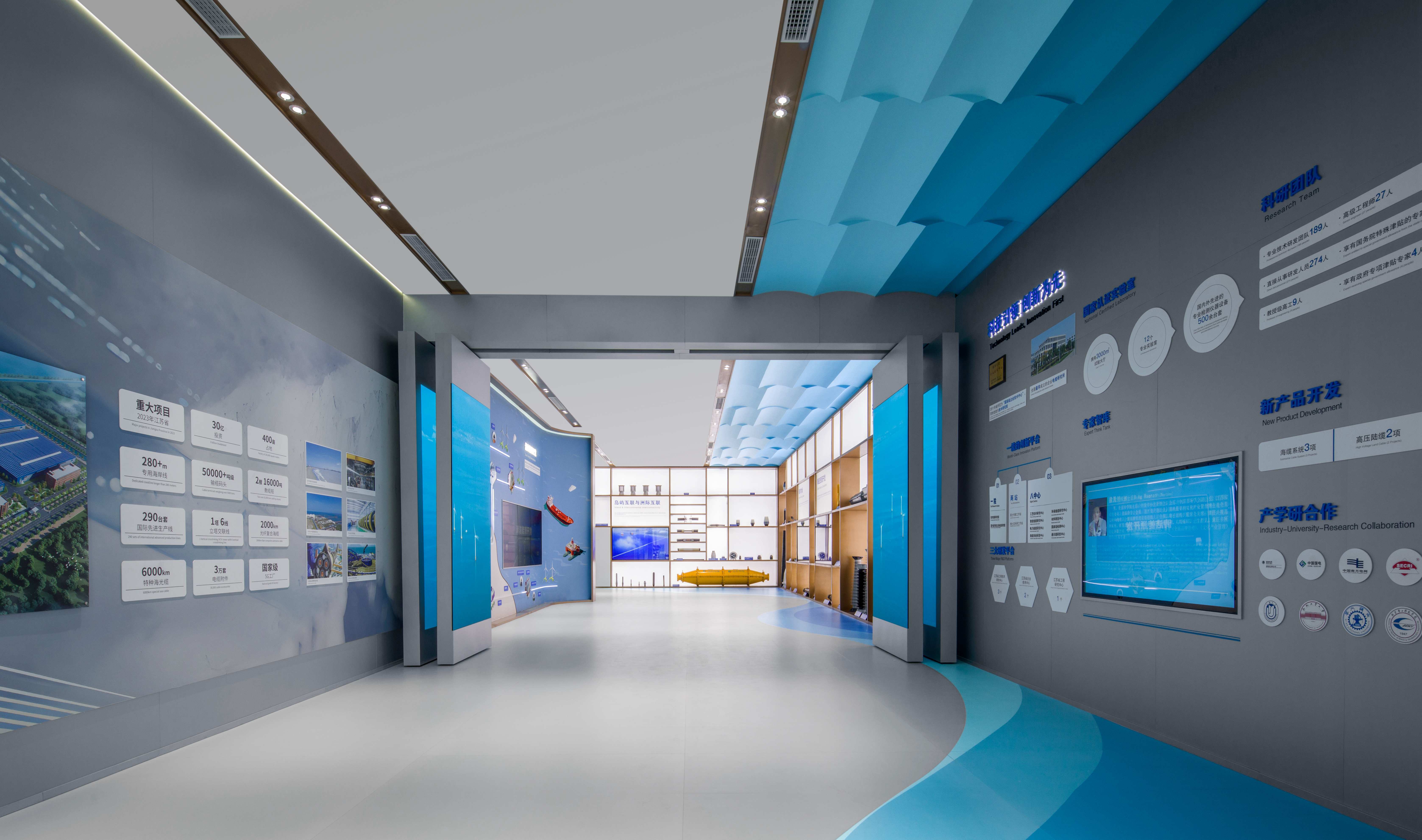 一家科技型企业,如何用独特的设计美学语言,讲述“新质”故事?步入展厅,答案逐渐清晰——深邃的科技蓝与流动的空间线条,瞬间将人带入海洋语境,随着脚步前行,远东集团的发展历程与产业布局如卷轴般徐徐展开。