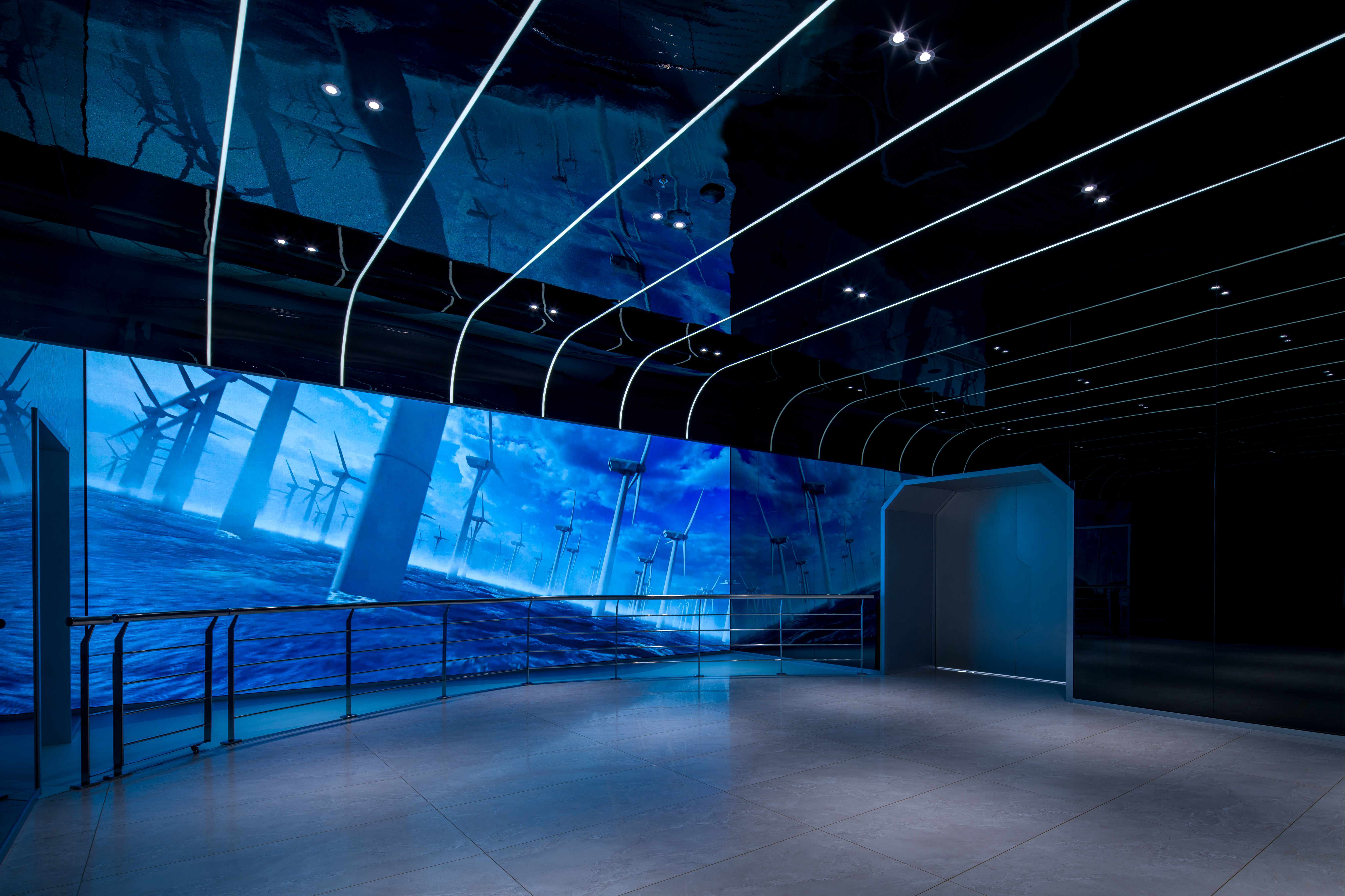 展厅中的开合屏幕,就像一道通往数智化的“科技大门”。巨幕上播放的短片,以海上风电全景为底,点亮远东集合“设计—制造—敷设—运维”多环节的一站式解决方案,生动展示出企业的核心竞争力。短片结束后,巨幕缓缓打开,参观者由此步入智慧互联与深蓝能源交汇的“海洋”。
