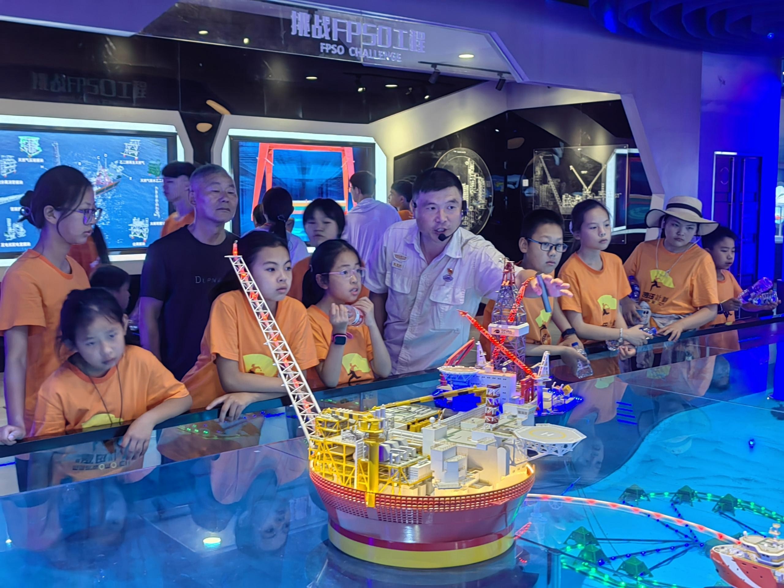而博物馆二楼,是一个认识海洋的科普“窗口”。海洋初探、时空隧道、海岸扬帆、海底探宝、多元海洋、星辰大海6个区域,展示了海洋工程从古至今、从浅海到深远海的发展历程。在这里,参观者可以对照沙盘了解深埋于海底的石油是如何变成成品油被油轮运往世界各地的,还能通过小游戏体验“建造”FPSO。
