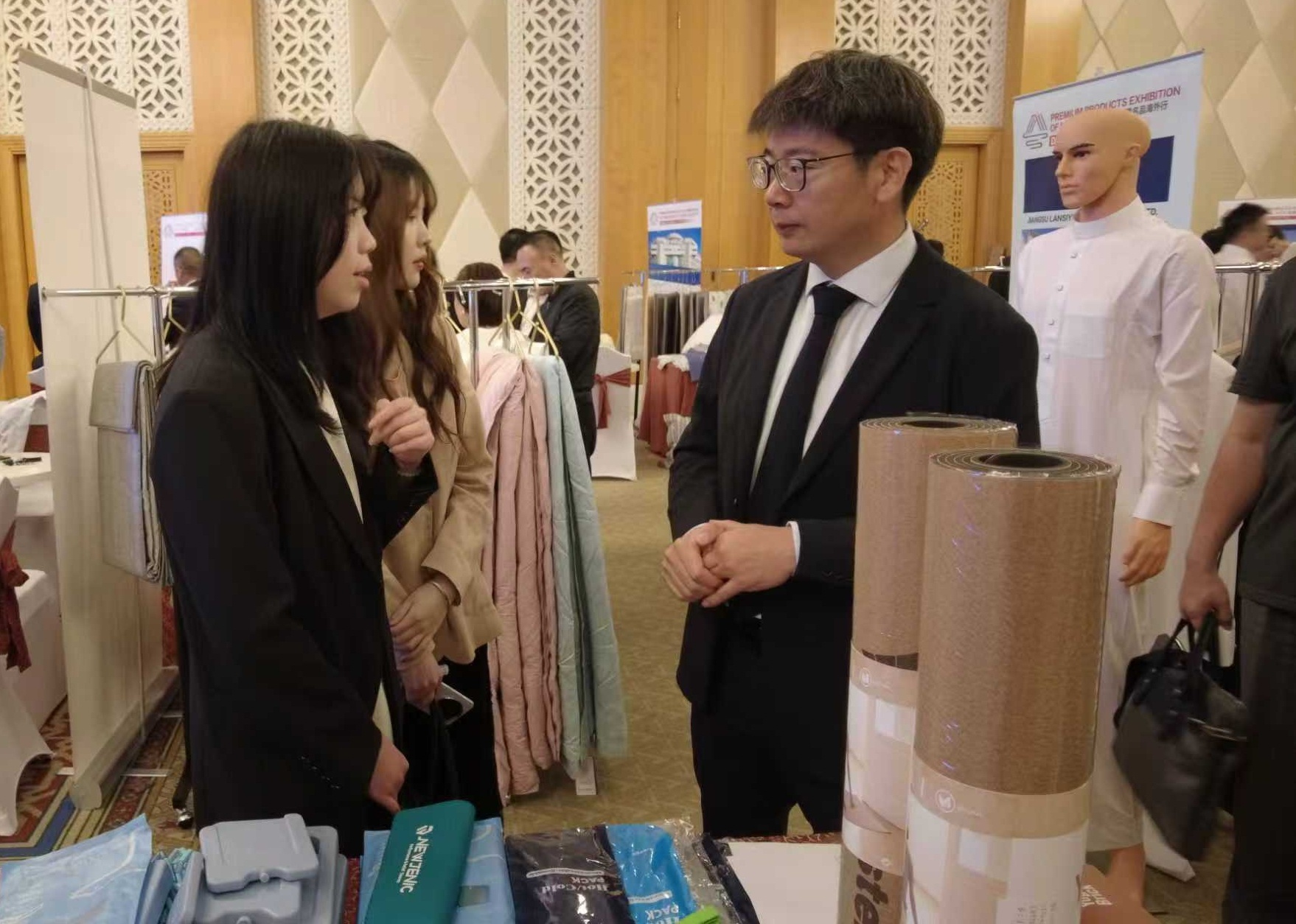 本次活动组织24家南通家纺、服装企业代表参展,吸引了50余名中东采购商现场采购。在产业推介环节,南通国际家纺产业园区和南通市服装协会分别介绍了家纺和服装产业的发展情况,江苏凯瑞家纺、江苏爱格斯凯服装等企业代表分享了在智能制造与国际化拓展方面的实践成果。随后的对接现场洽谈活跃,来自南通的千余款家纺、服装产品吸引了采购商驻足交流。