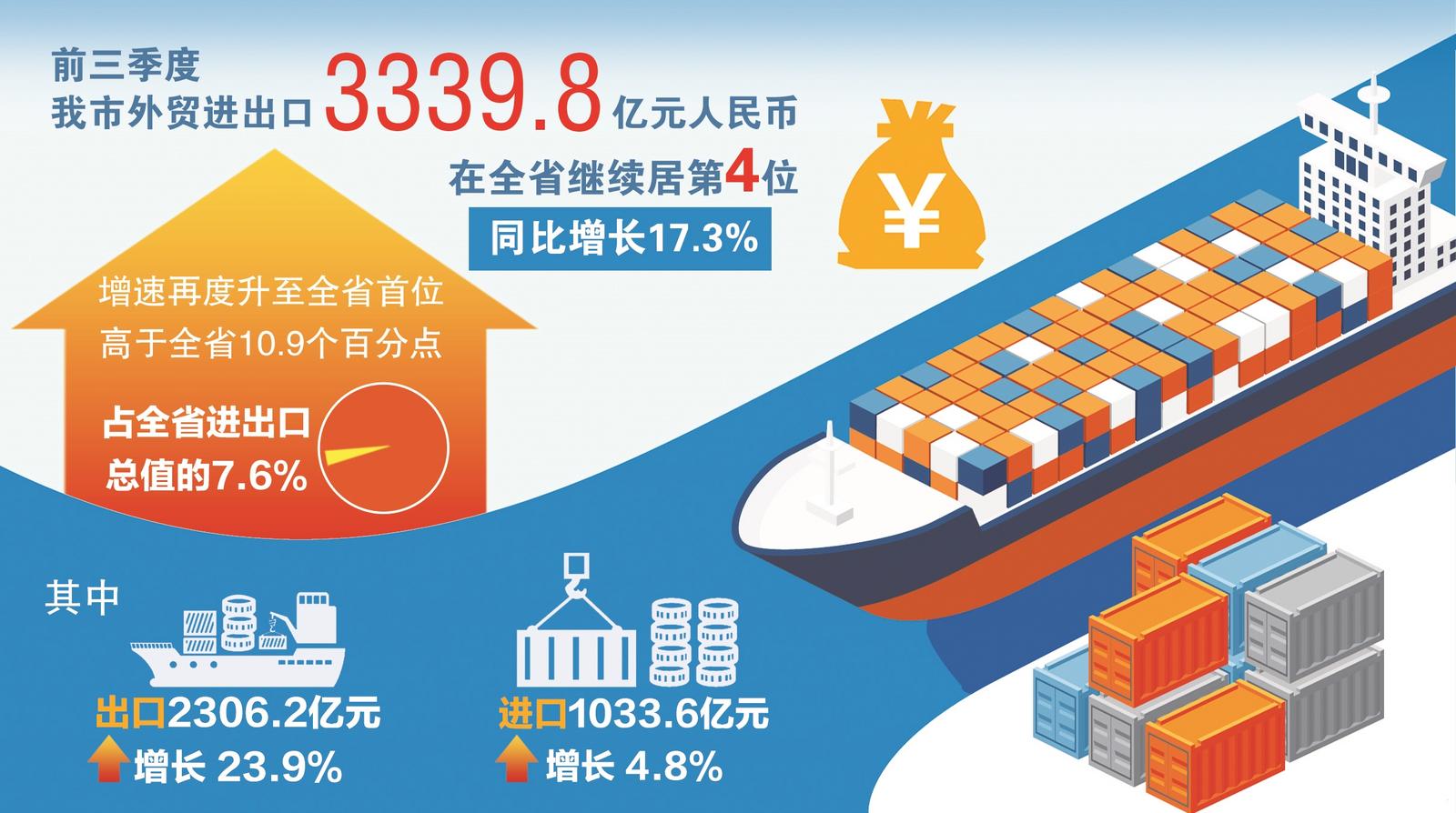 本报讯 (通讯员凌微子 记者吴霄云)南通海关统计,2025年前三季度,我市外贸进出口3339.8亿元人民币,在全省继续居第4位,同比增长17.3%,增速再度升至全省首位,高于全省10.9个百分点,占全省进出口总值的7.6%。其中,出口2306.2亿元,增长23.9%;进口1033.6亿元,增长4.8%。