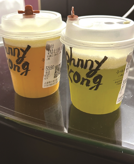 小璇说,这两款饮品是有青柠味奶盖的特调茶酒,可以根据个人口味偏好选择不同的酒精度数,而且,酒精度数都在10%vol以下,适合初次尝试微醺茶饮的“小白”。“不同的是,‘壮士且慢’入口就能感受到浓郁的芒果果香,搭配上龙舌兰和香柠基酒,口感层次非常丰富;‘倒满倒满’则以清甜的蜜瓜味为主调,还带着一丝淡雅的茉莉绿茶清香,与伏特加融合得恰到好处。”