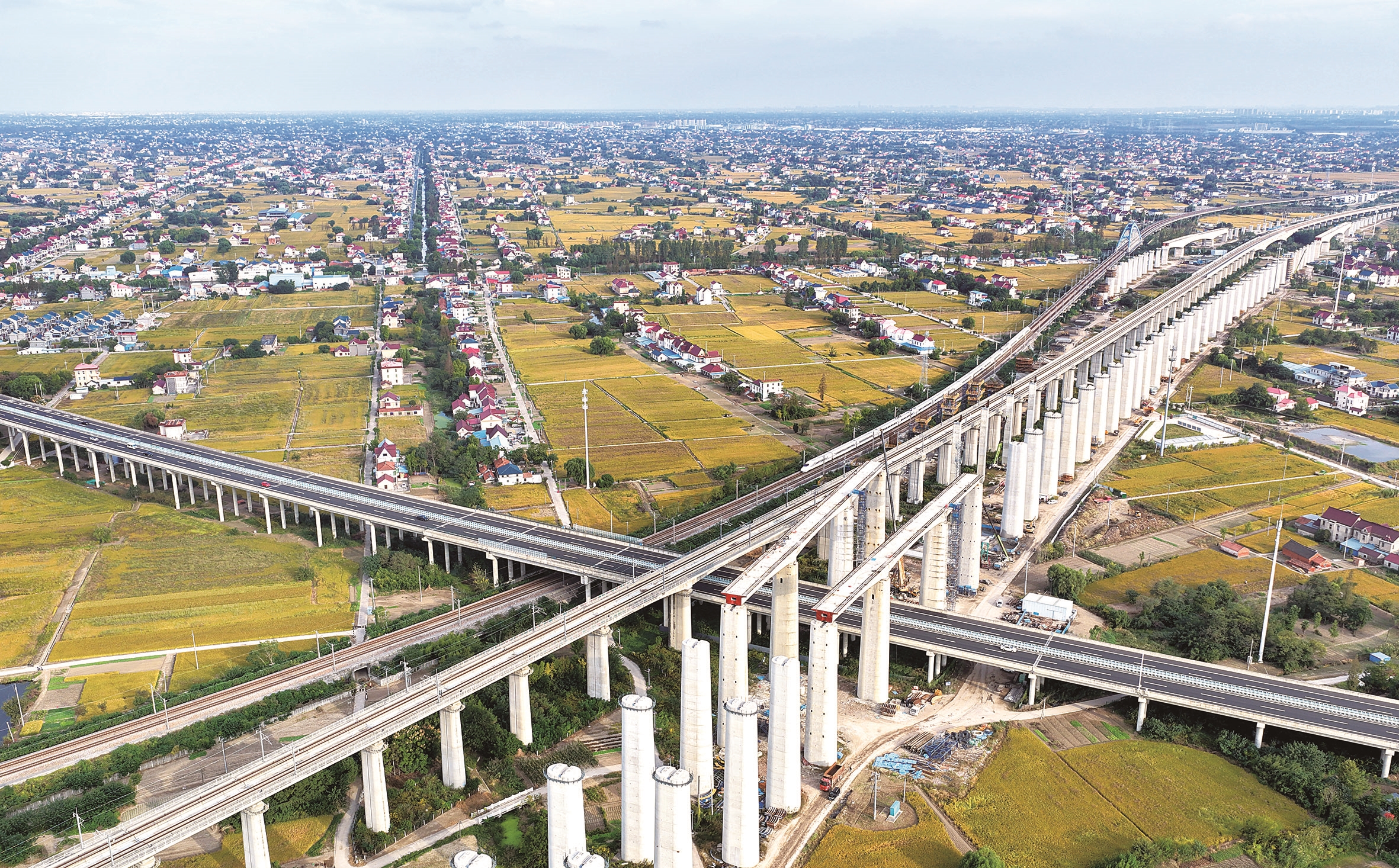 25日,动车组在通州区辖区的北沿江高铁跨通锡高速施工现场驶过。目前,北沿江高铁江苏段多个控制性节点工程正有序推进。北沿江高铁江苏段开通后,将填补江苏长江北岸地区的高铁空白,苏中的南通、泰州、扬州将全面融入上海、南京的“1小时高铁圈”。 记者 许丛军摄