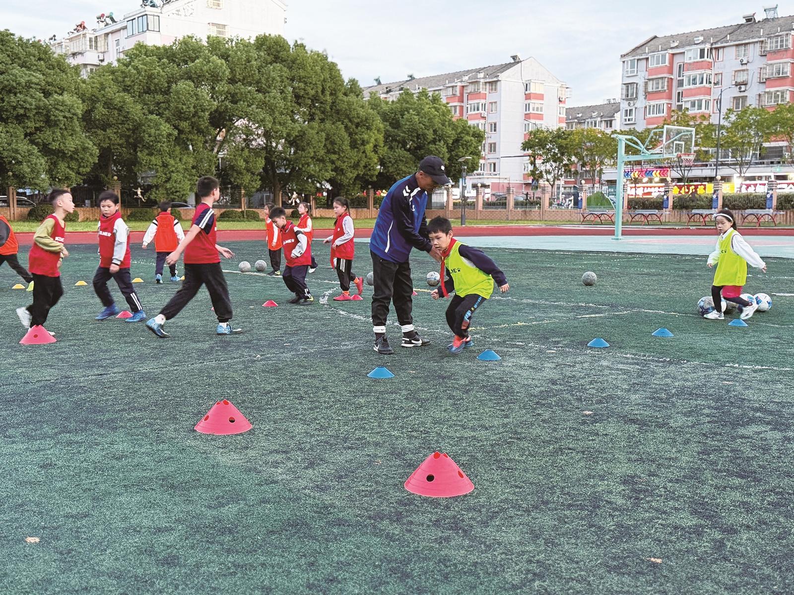 “脚尖轻轻点,带着球绕过去……”29日下午四点半,十里坊小学的操场上,一群身着球衣的孩子跟在体育老师身后,展开运球绕桩的日常训练,个个精神抖擞。“我觉得带着球绕桩就像在跳格子,特别好玩!”一年级学生陆思媛额前的头发被汗水濡湿,眼睛却亮闪闪的。她这学期刚刚加入足球社团,已经“喜欢上了踢球”。
