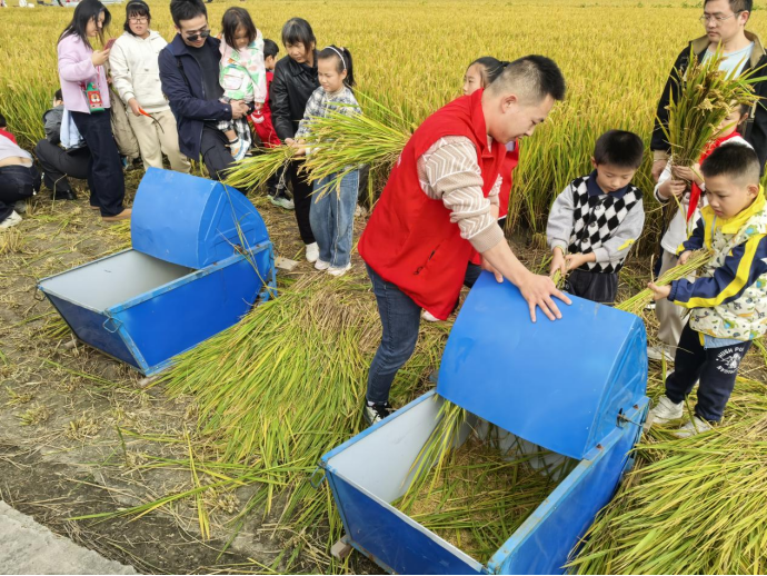 走进农场,浓郁的稻香扑面而来。阳光洒向鎏金的稻穗,与田间欢声笑语交织成一幅动人的丰收画卷。在“农耕体验区”,孩子们手握镰刀,在志愿者指导下俯身收割,沉甸甸的稻穗被小心揽入怀中。打稻机旁,志愿者边操作边讲解,金黄的谷粒欢跳入仓。“孩子第一次体验收割,懂得了‘粒粒皆辛苦’的含义。”一位家长感慨道。农耕的辛劳与丰收的喜悦,在这一割一打间深植童心。