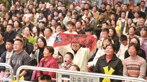 在南通圆融广场,学田街道南川园社区工作人员张俊杰一边维持现场秩序,一边记录市民的欢呼与扼腕。他坦言,今年9月参与社区工作后,虽不能和亲朋好友一起观赛,但和更多市民一起在“第二现场”,更有氛围。“我也要像南通队一样,在日常工作中发光发热,展现年轻人的风采。”