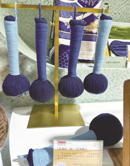 作为“苏超”的“人气战队”,南通元素在进博舞台上持续刷足存在感。展馆上空,13支球队主题毛巾高高悬挂,宛如一道流动的风景线。这些来自“纺织之乡”江苏不懒人公司的产品,成为许多观众争相购买的人气单品。蓝印花布艾草榔头则玩转了非遗的“潮玩法”。这款谐音“狼头”的助威神器,既承载着勇猛登顶的美好寓意,更兼具敲打放松的实用功能。“看球时能助威,办公累了能解压,这个创意很棒!”来自上海的李先生爱不释手,现场直接下单两个。