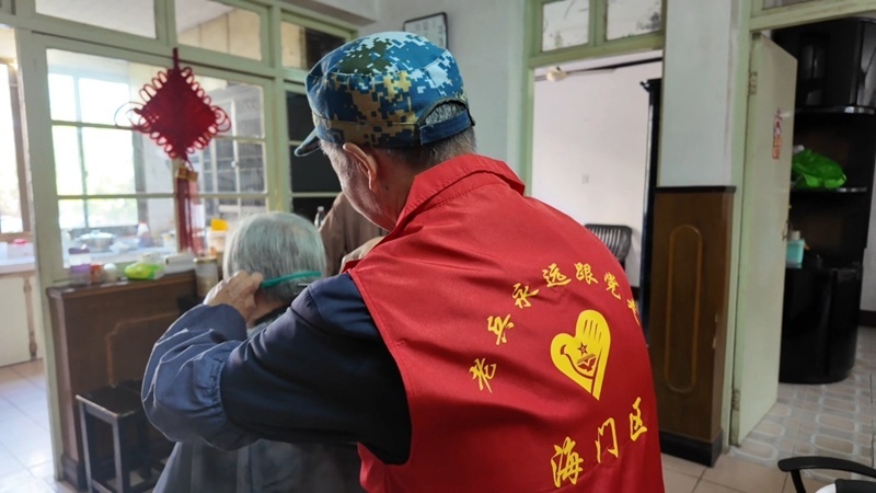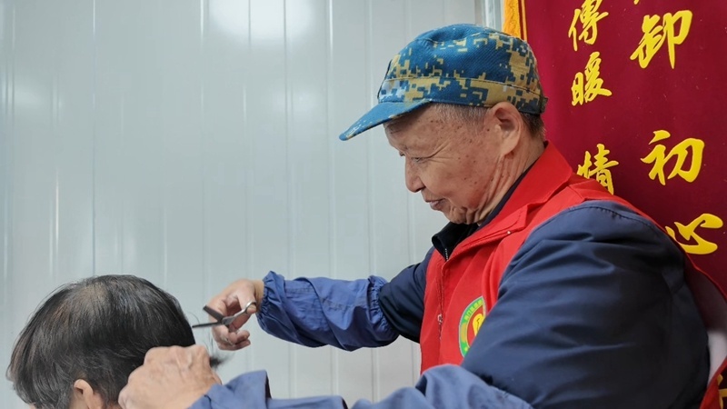 清晨的阳光透过玻璃,洒在江苏省南通市海门区“红色驿站——老兵先锋岗”内。一位精神矍铄的老人正手持推剪,娴熟地为一位坐着轮椅的老者理发。细碎的银发飘落,伴随着剪刀的“咔嚓”声和两人不时的轻声交谈,画面宁静而温馨。这位志愿者,就是年过七旬,曾荣立一等功的海军航空兵退役老兵陆志飞。这把小小的推剪,在他手中已辗转了将近50年,从军营到社区,从未停歇。