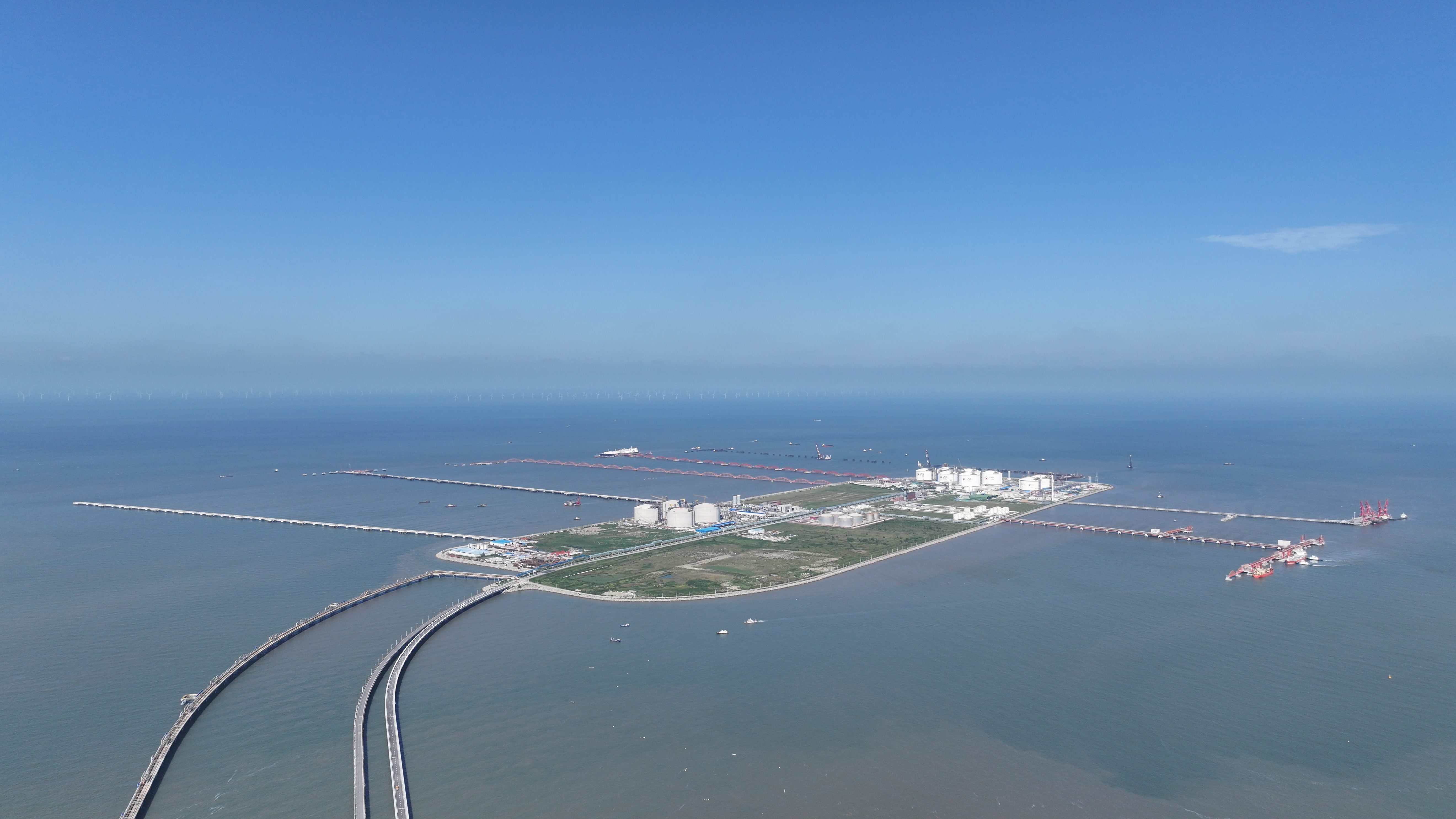 隔海相望的阳光岛上,正在建设中的江苏LNG项目三期配套码头未来将服务两座海上能源枢纽;通用码头“洋太”航线周五班列常态化运行;液化品码头以近乎一天一船的运转节奏,全面释放“产业港”功能。