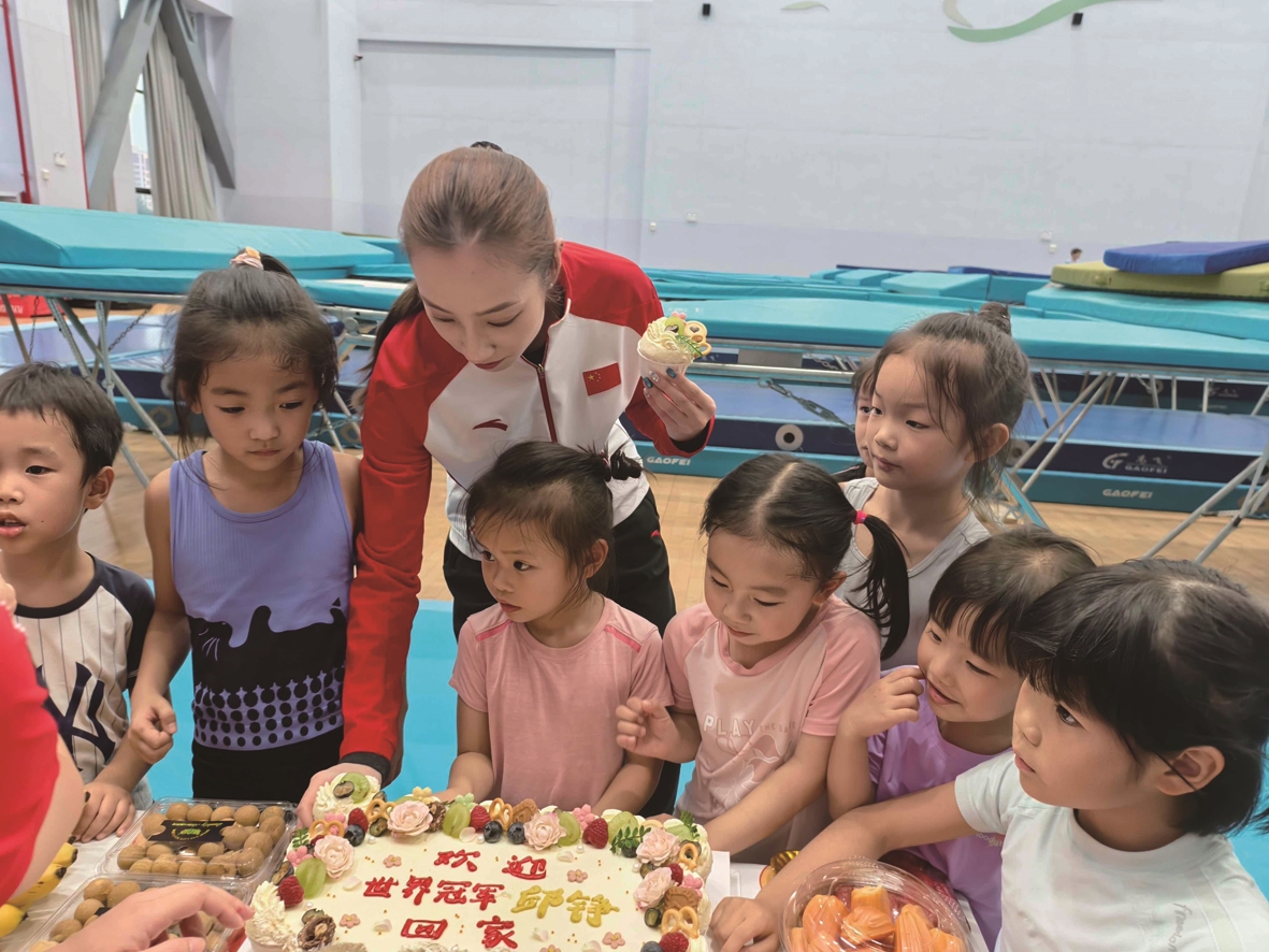 训练间隙,家长们捧着鲜花和定制的蛋糕走进来,蛋糕上印着“欢迎世界冠军邱铮回家”的字样。邱铮与师弟师妹们围在一起,分享着蛋糕。看着身边朝气蓬勃的小运动员们,她的语气中充满了感慨:“看到他们,我真的感受到了蹦床运动的新鲜活力。”当被问及拿到世锦赛冠军后的感受时,邱铮认真地说:“这个冠军不是终点。蹦床运动还有更高的山峰等着我去攀登。” 记者朱颖亮
