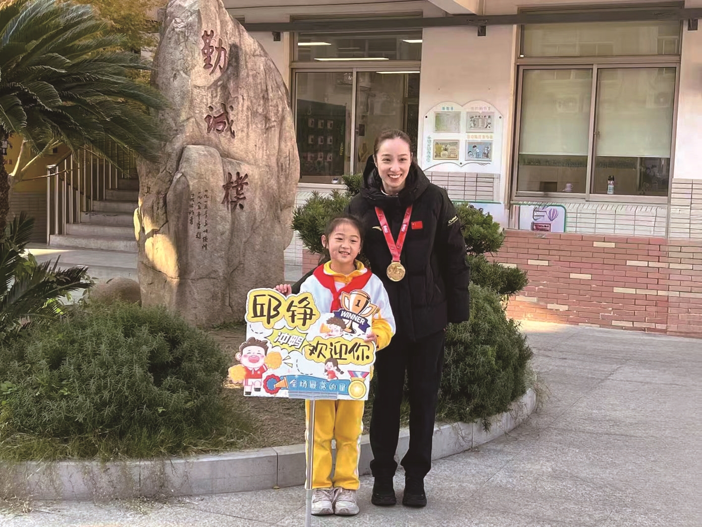 “欢迎邱铮姐姐回母校!”昨天下午,南通市跃龙桥小学操场上人头攒动,学生们齐声高呼,欢迎刚刚在2025年世界蹦床锦标赛上夺得女子团体冠军的邱铮。