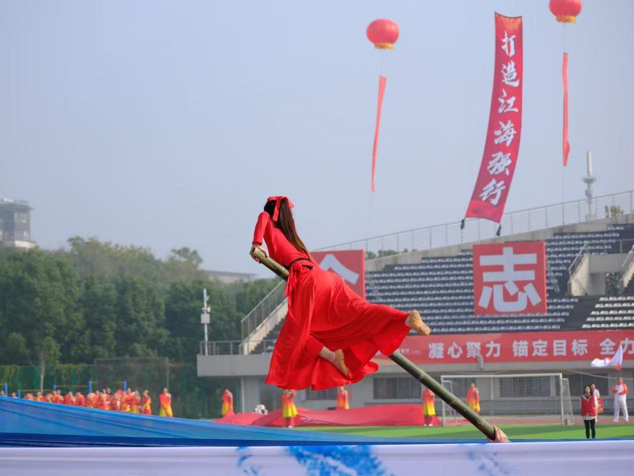 中段“红衣跃竿”。 10名红衣组演员随鼓点跳起群舞,自然组成底座,用竹竿将1名舞者挑起至空中完成高难度造型。蓝印组同步抛布配合,展现体育力量之美。方阵组手持红伞做出旋转、挥舞等整齐划一的动作。两架无人机展开8米长条幅“培育第二曲线,打造江海强行”,从远处飞向主席台,将现场气氛推向高潮。