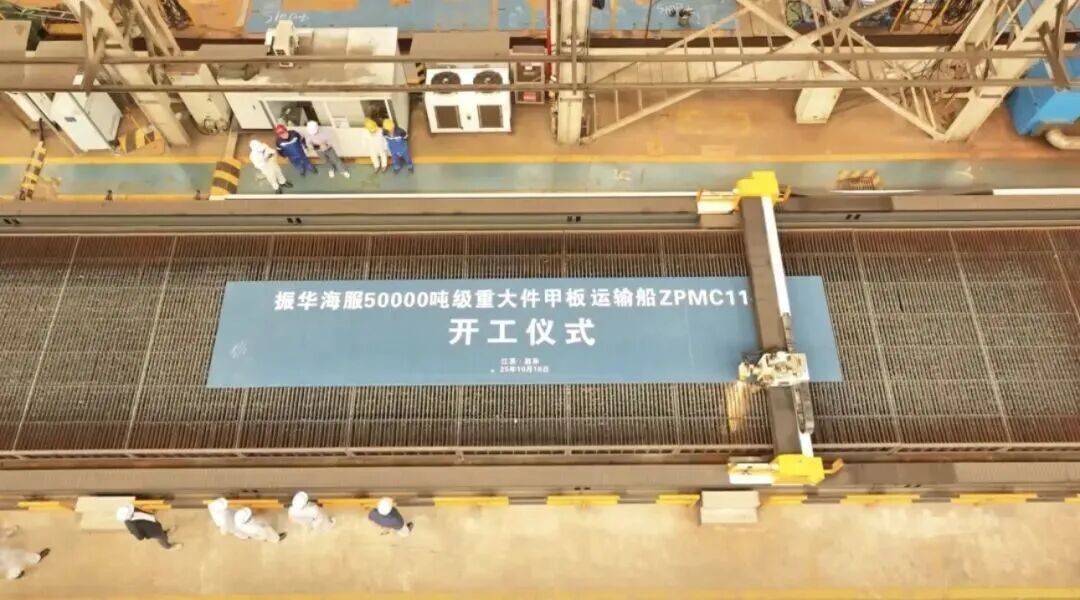 10月16日,南通启东振华海工建造的5万吨级重大件甲板运输船“振华38”轮开工,该船总长217米、船宽43米、型深13.5米。该船是企业自主设计建造运营,具备“智能+绿色”双轨能力的大型重大件甲板船,在研发设计阶段即融合智能航运与绿色动力技术,是国内同类型船舶中首个同步实现智能系统全覆盖和甲醇燃料预留设计的重大件运输船。