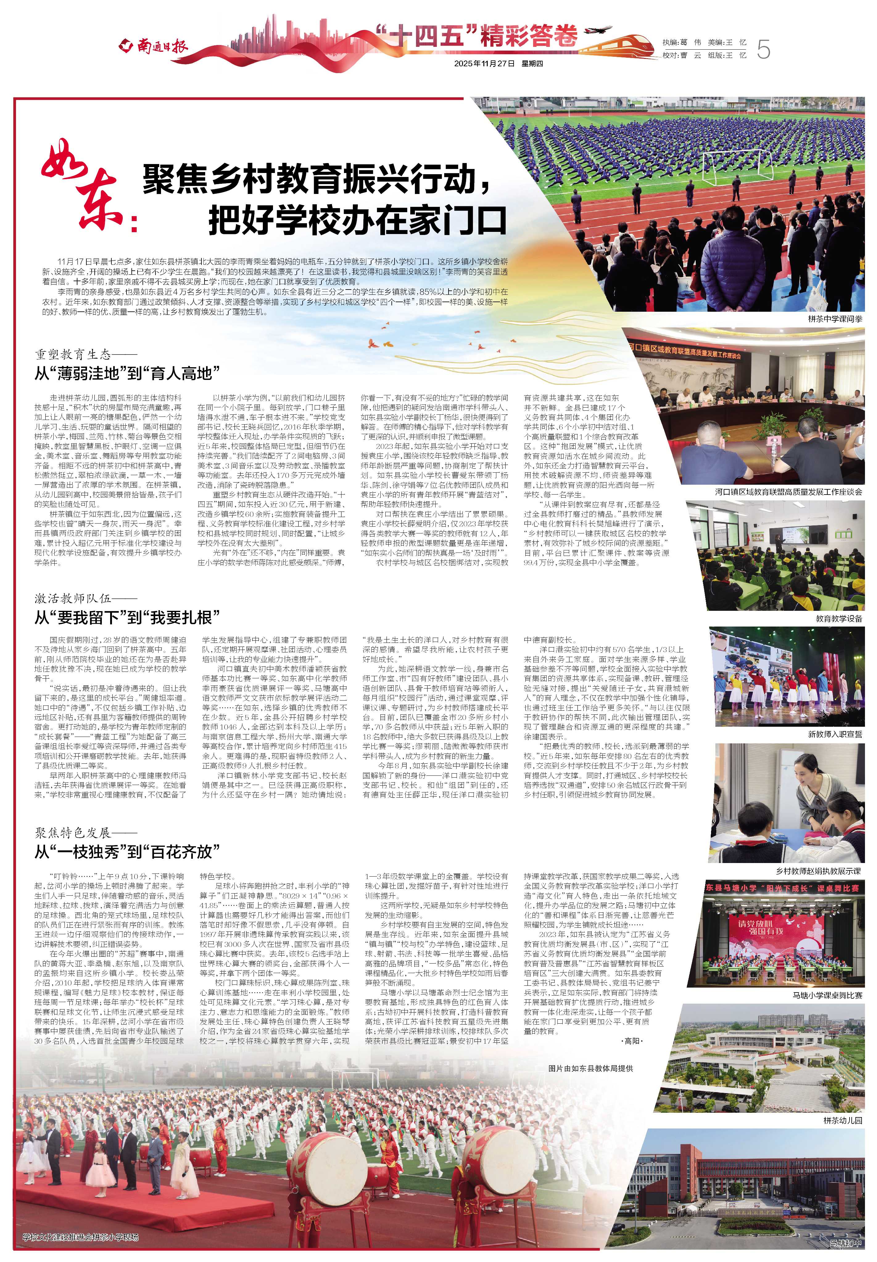 河口镇直夫初中美术教师潘颖获省教师基本功比赛一等奖、如东高中化学教师季雨豪获省优质课展评一等奖、马塘高中语文教师严文文获市依标教学展评活动二等奖……在如东,选择乡镇的优秀教师不在少数。近5年,全县公开招聘乡村学校教师1046人,全部达到本科及以上学历;与南京信息工程大学、扬州大学、南通大学等高校合作,累计培养定向乡村师范生415余人。更难得的是,现职省特级教师2人、正高级教师9人扎根乡村任教。