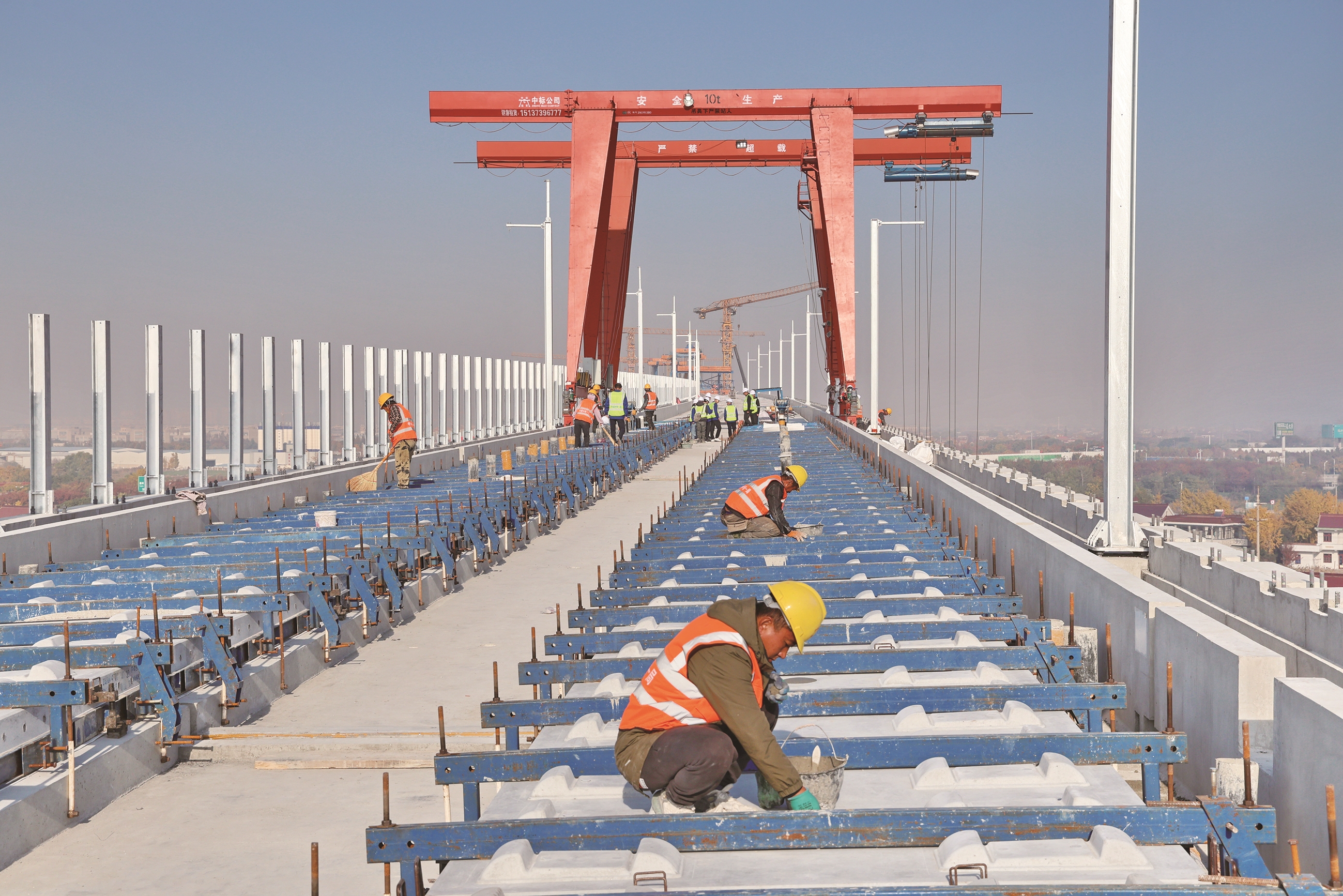沪渝蓉高铁沪宁段站前Ⅶ标位于南通市海门区与通州区境内,正线全长21.37公里,其中南通特大桥15.5公里,其中无砟轨道直线段5.927公里,曲线段9.573公里。南通特大桥采用CRTSⅢ型板式无砟轨道结构设计。线路位于弯道区段,这要求轨道板两侧有5厘米的设计高差,以确保高铁列车能平稳安全地高速过弯,同时,每块承轨台的施工误差必须控制在1毫米内,相当于头发丝的厚度。施工团队自主研发底座板跨线整平一体机、数智粗铺机、数智精调车、数智混凝土灌注车等智能化工装设备,创新应用26项小型工装,总结形成“一板八测二检一分析”施工工艺,着力打造精品示范工程。