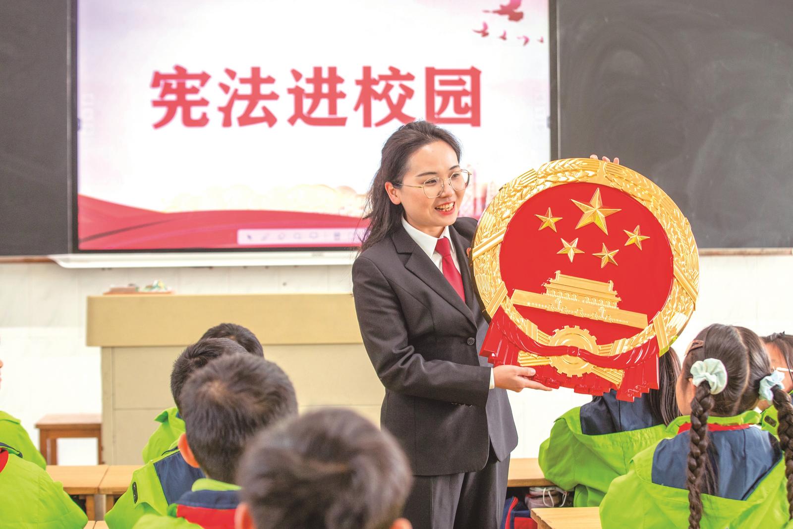 昨天,通州区人民法院的法官在通州小学给学生们讲解宪法知识。在“国家宪法日”即将到来之际,通州区人民法院与通州小学联合开展“宪法进校园”活动,通过诵读宪法、认识国徽、互动问答等形式,帮助学生们增强宪法意识、弘扬宪法精神。 翟慧勇摄
