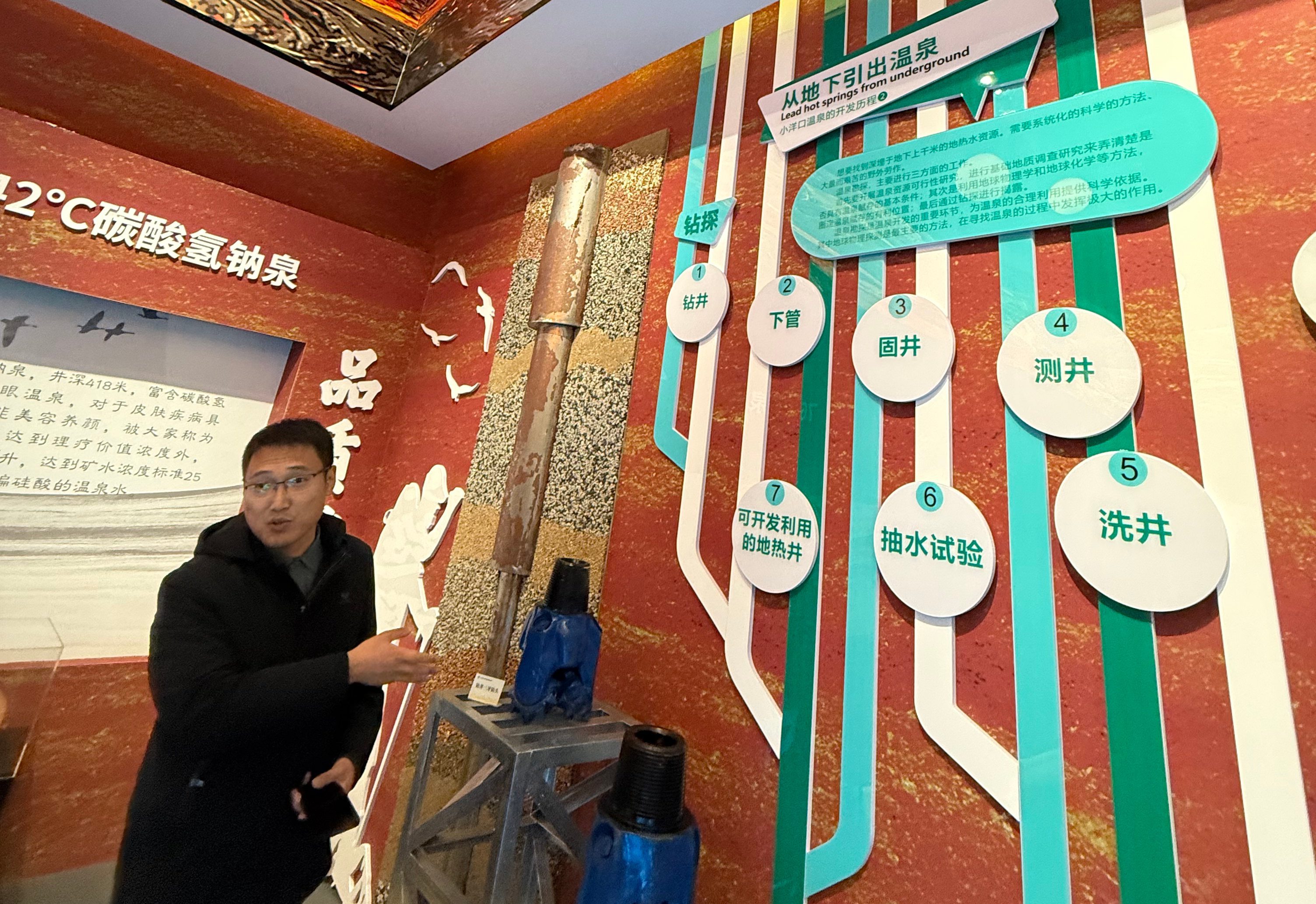 这口深达3501.66米的地热井,以108℃的出水温度和单日超5360立方米的涌水量,刷新我国东南沿海地热勘查纪录,也标志着省级矿地融合项目“江苏省重点地区清洁地热能源高效综合利用示范”取得关键进展。而在不远处的温泉展示中心,这股来自地下的热能被全方位接收——从发电、烘干、供暖到温泉康养,展现出一条清晰的地热“梯级利用”路径。