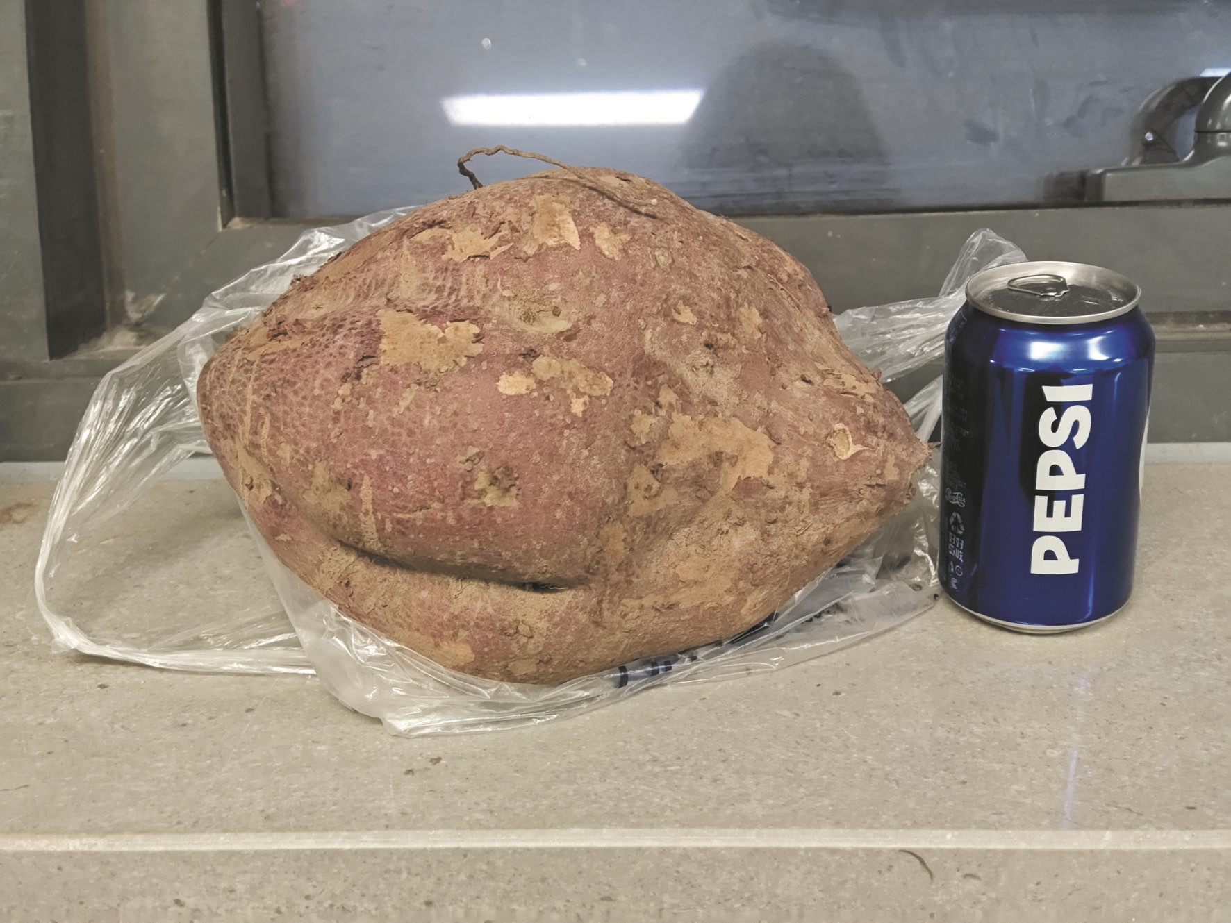 向本报新闻热线反映这个“趣闻”的张超老先生,今年91岁,老家在如东县。老先生告诉记者,4日当天,如东老家的一位农妇给她捎来了自家种植的蔬菜,最令他和老伴吃惊的是,捎来的几个红薯中,有一颗个头之大让他吓了一跳,用便携式电子秤一称,重量接近6斤!记者看到红薯确实块头不小,平时在农贸市场确实难见。