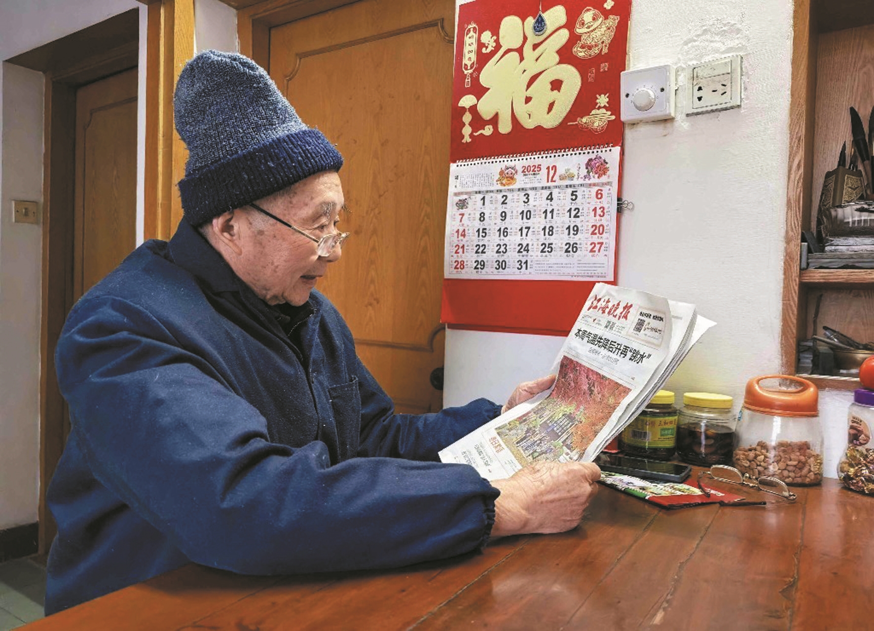 陆文藻在阅读《江海晚报》。记者尤炼