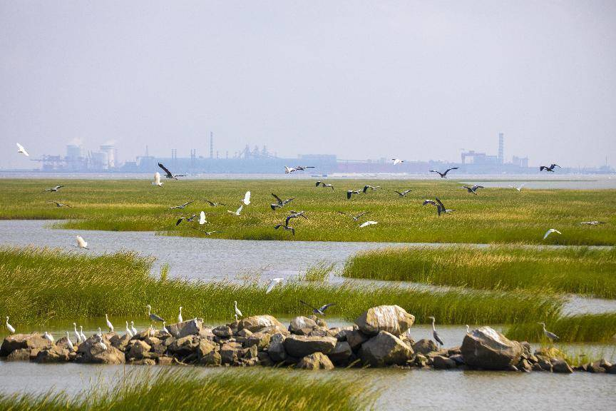 初冬的启东长江口北支湿地,成群的候鸟掠过水面,黑脸琵鹭、黄嘴白鹭等珍稀鸟类在滩涂上悠然觅食,为这片三水交汇之地增添了灵动生机。