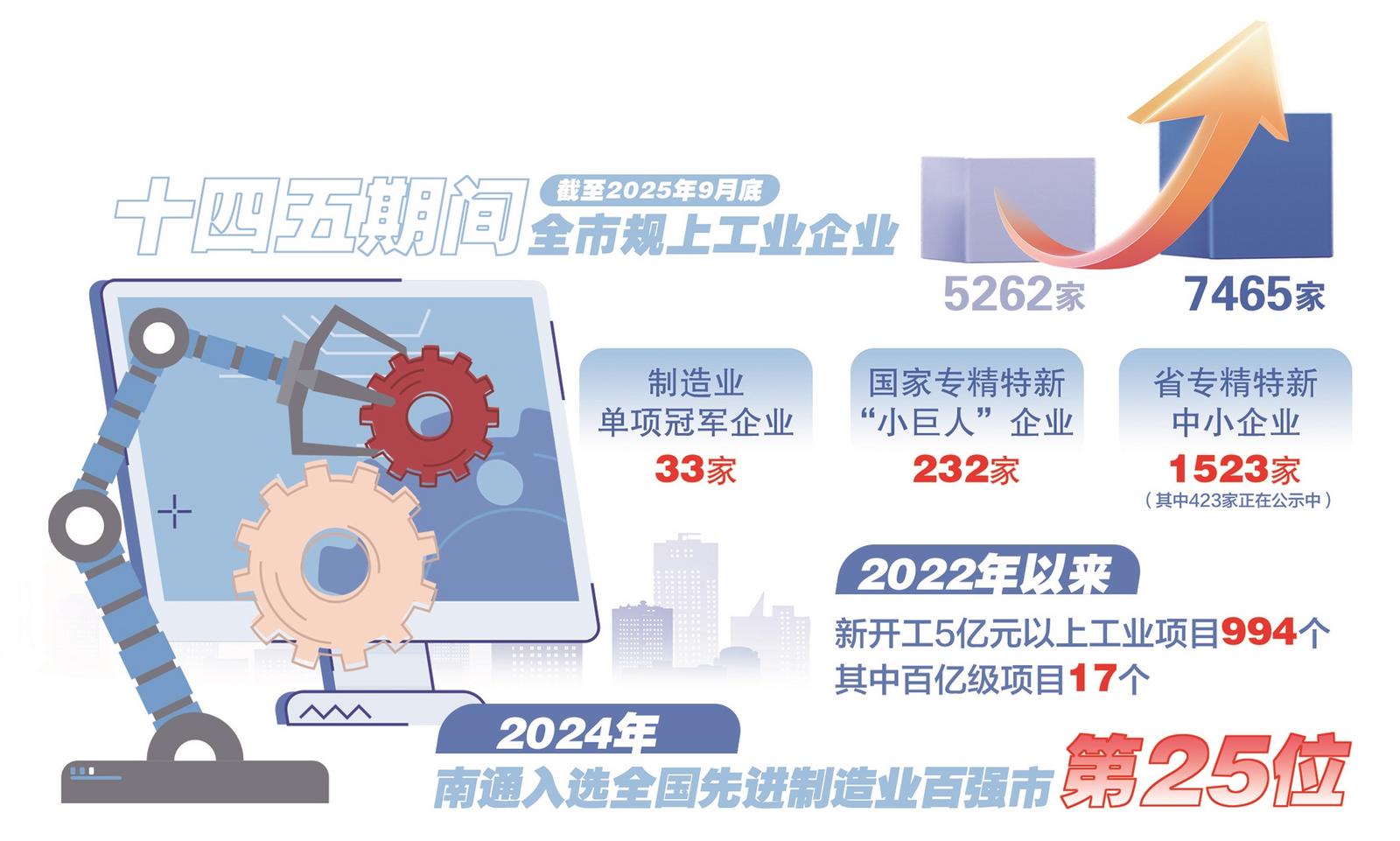工业总量显著增长。全市规上工业企业从5262家增长到7465家(截至2025年9月底),规上工业增加值年均增长8.7%,高于全省平均0.8个百分点;2024年全市工业增加值占GDP比重达38.2%,对GDP增长贡献度达46.0%,工业就业人口约占全部就业人口1/3。工信部门全力服务重大项目快建设、快投产,2022年以来新开工5亿元以上工业项目994个,其中百亿级项目17个,总投资约8100亿元。中石油蓝海新材料、中天绿色精品钢、恒科功能性纤维新材料、 (下转2版)