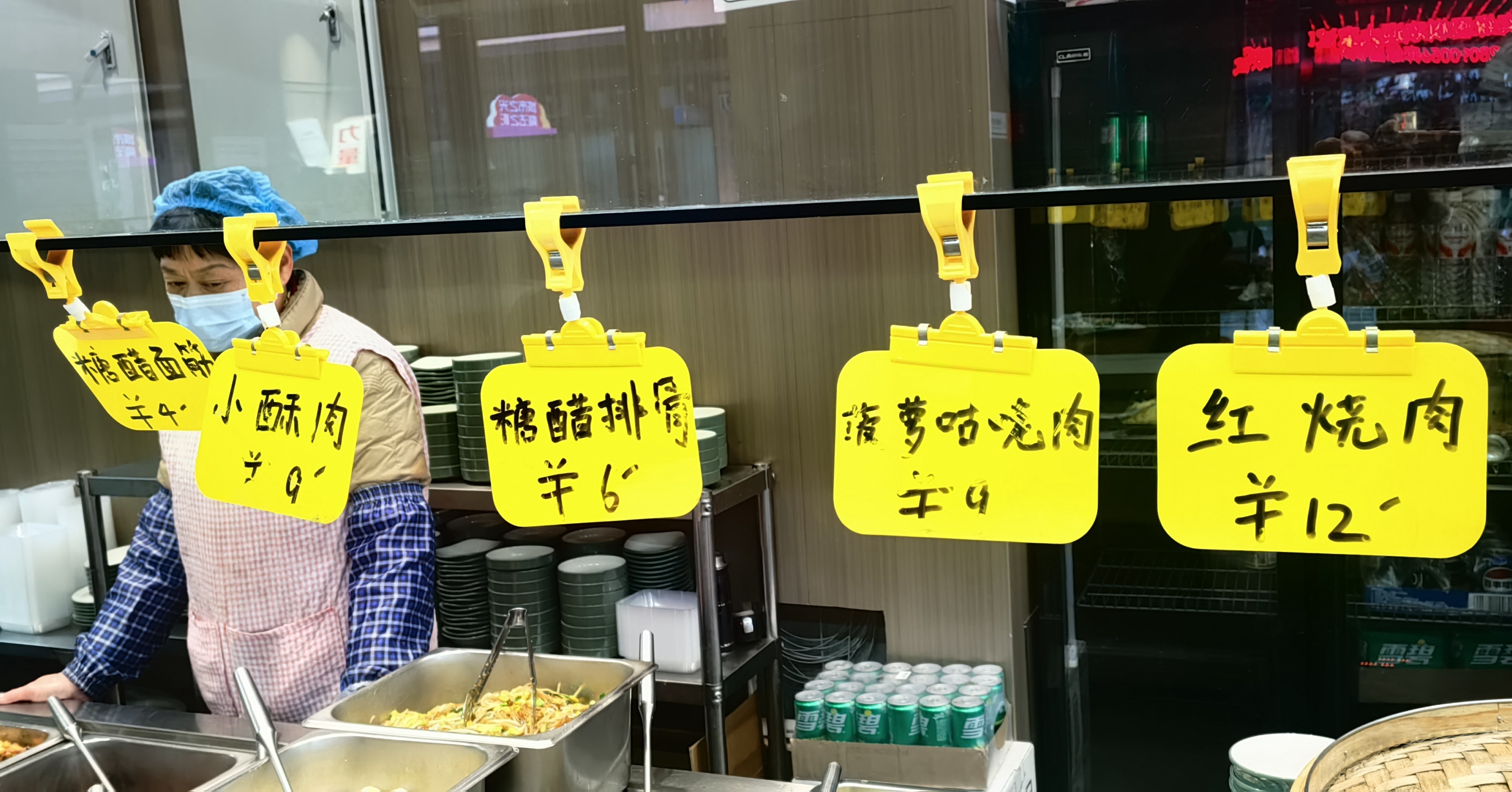 随着午市的到来,这个240多平方米、上下两层的空间渐次坐满。档口陈列着30多种热气腾腾的菜品,价格一目了然:清炒时蔬最低2元,荤菜多在十余元。
