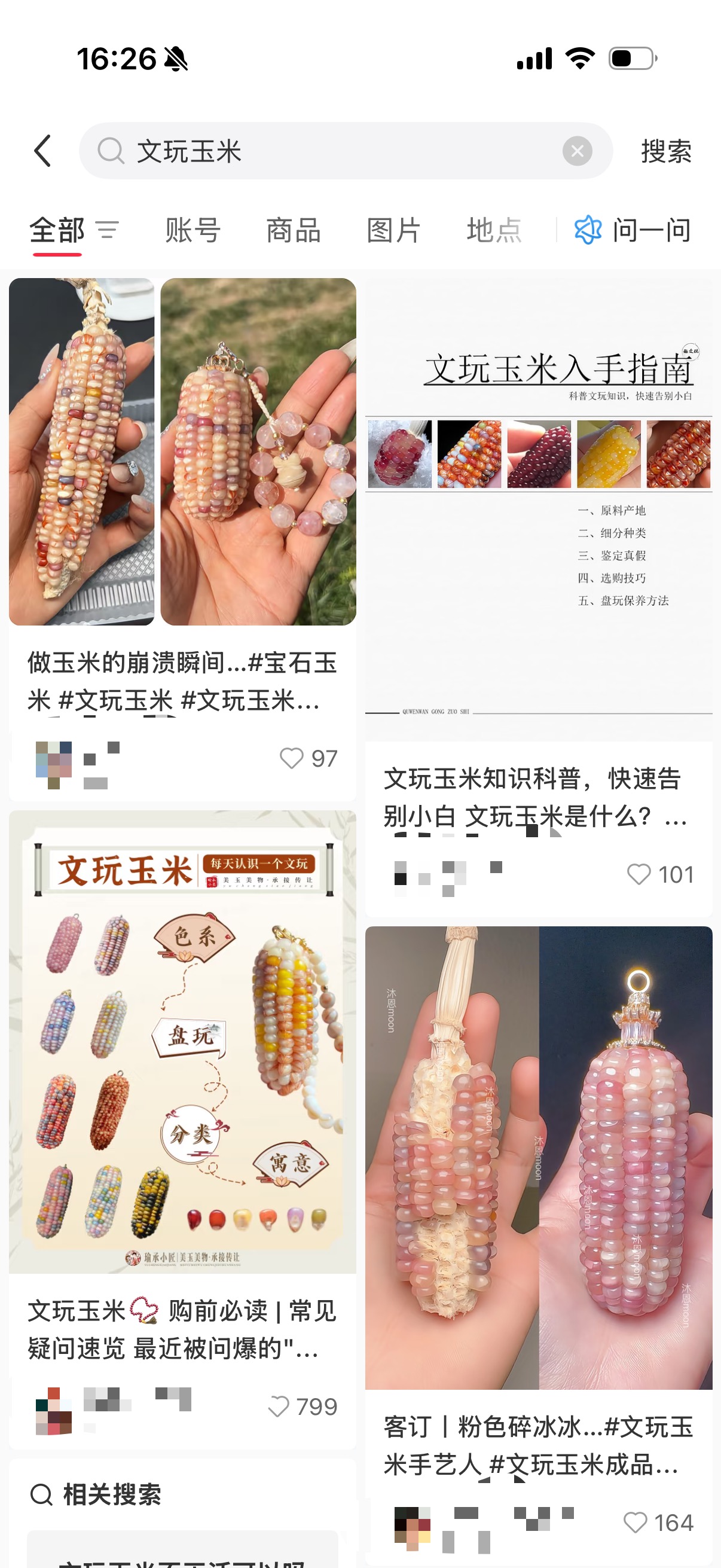 还有一些消费者介绍,相对于葫芦、核桃等文玩,文玩玉米的稳定性较差,需要精心照料。盘玩时尽量不要接触到水,平时也不要用湿布擦拭,要尽量保持干燥。