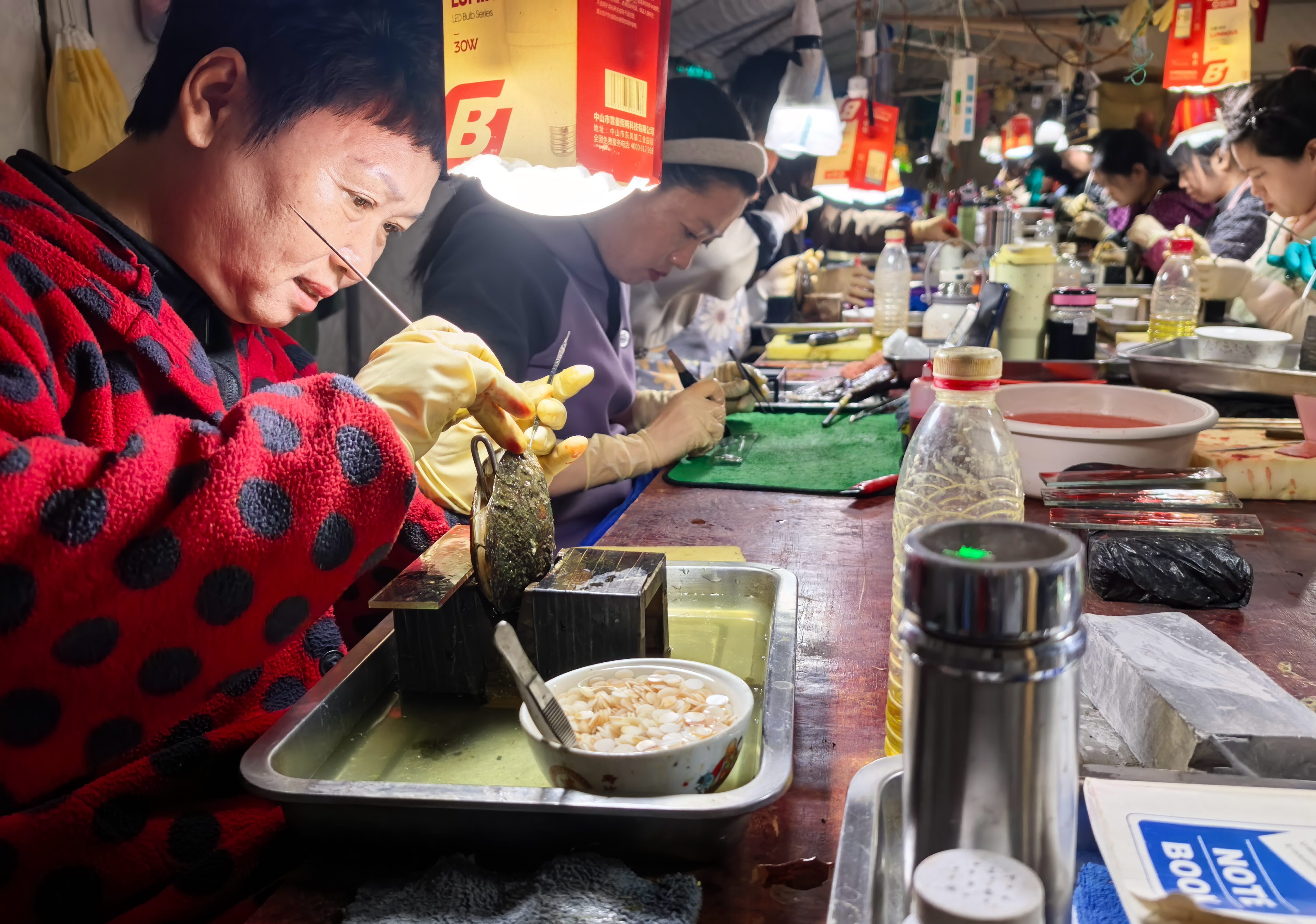 12月9日一大早,如皋市白蒲镇林马河附近的植蚌车间灯火通明。嫁接师傅们手持特制工具,撬壳、切割、植入,动作流畅如行云流水。这里是珍珠成形的第一站——嫁接。