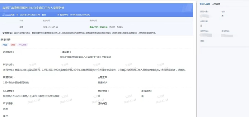 12月18日下午,启东市公安局汇龙镇派出所收到一份12345热线表扬工单,市民陆先生对启东市汇龙镇便民服务中心民辅警的暖心服务表示感谢。