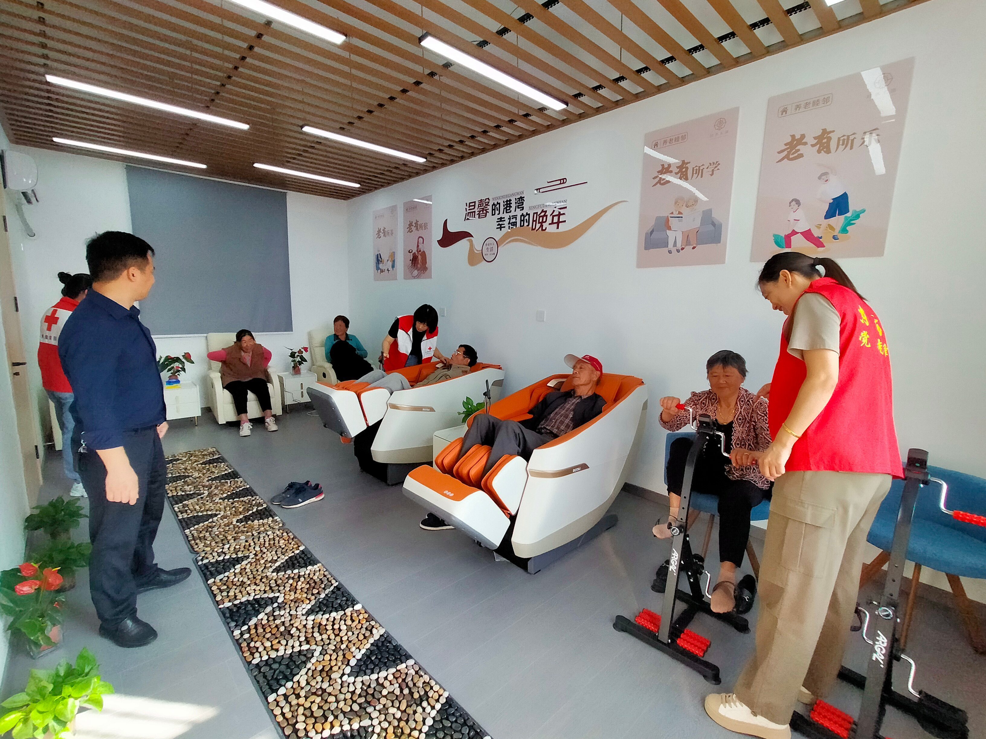 消息传开后,老人们便呼啦啦来了一大群。而为了把老人们留下来,村干部们用心“装扮”睦邻点:电动按摩椅旁有操作教学视频、茶室内添置了摔不碎的搪瓷杯、观影区安排上每日节目单……而这些改变,都是在和老人们一次次的交流中慢慢摸索出来的。