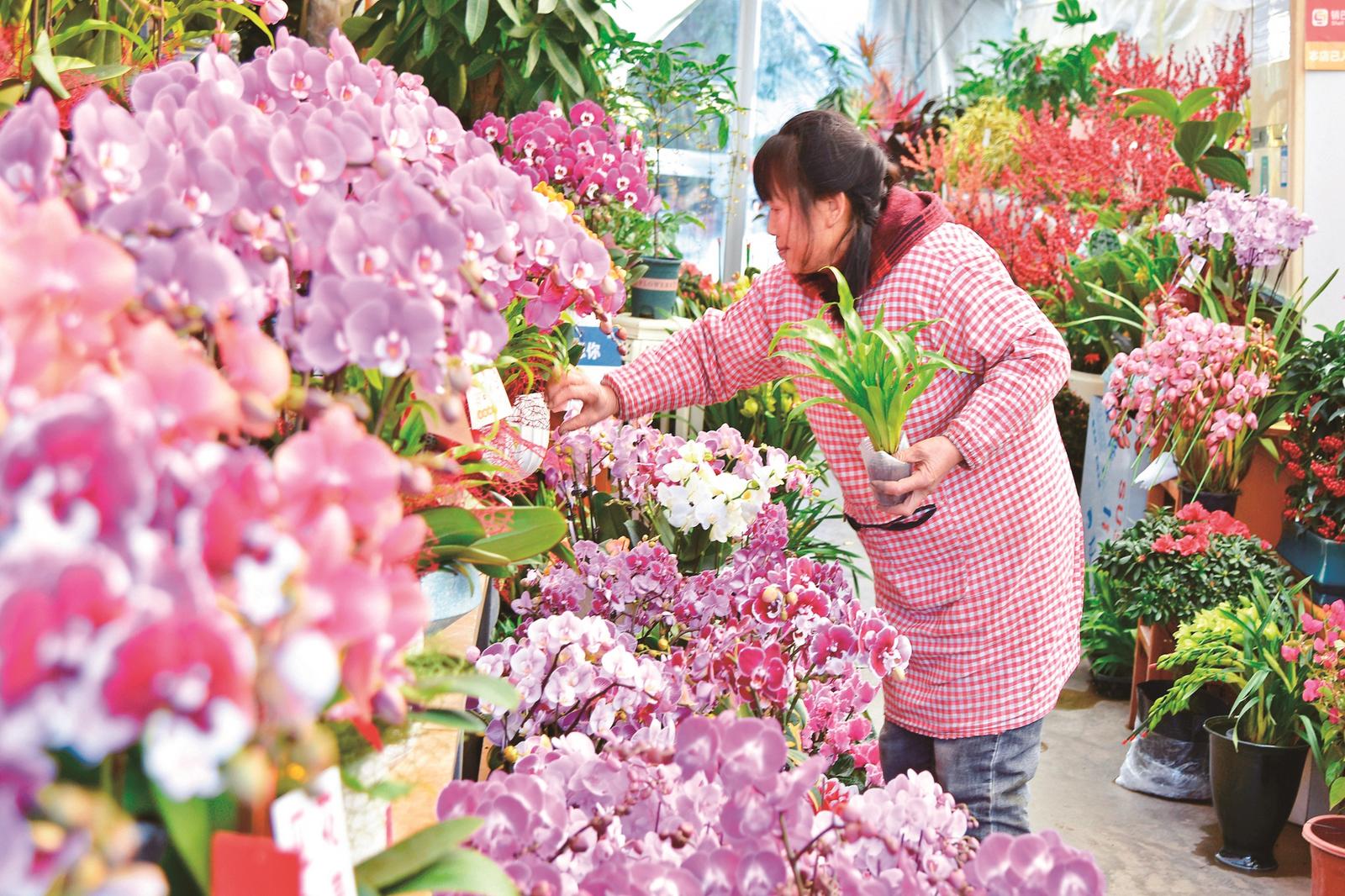 昨天,在如皋市如城街道大明社区一花卉种植基地,花农在管理待售的蝴蝶兰。新年将至,如皋迎来花卉销售旺季。近年来,当地因地制宜发展花卉产业,促进农民增收农业增效,让“鲜花经济”助推乡村振兴。 吴树建 秦春红摄