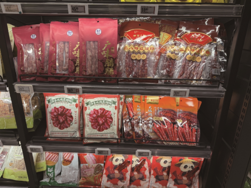 记者当天在盒马鲜生等商超看到,不少制造商也推出特色腌腊食品,其中酒香玫瑰露腊肠和火锅烧烤小香肠被放在了货架醒目的位置上。