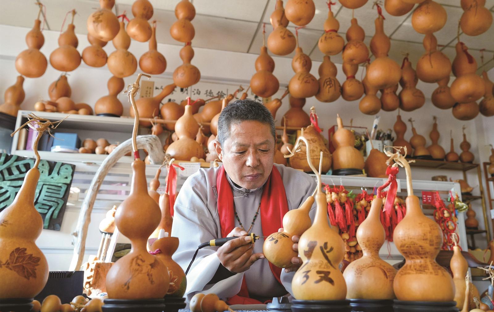昨天,南通市级非物质文化遗产海安葫芦工艺(葫芦画)传承人唐虎,在葫芦上运用烙画传统技艺,创作寓意吉祥期盼、美好祝愿的图案,传承弘扬中华优秀传统文化,迎接2026年的到来。 周强摄