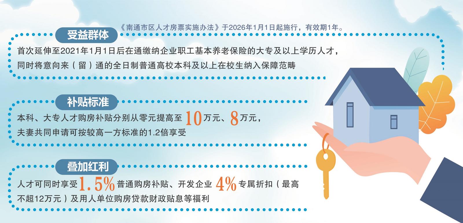 《办法》共涵盖适用原则、适用对象及标准、申领条件等7项核心内容,凸显扩围、提标、叠加三大特色。受益群体首次延伸至2021年1月1日后在通缴纳企业职工基本养老保险的大专及以上学历人才,同时将意向来(留)通的全日制普通高校本科及以上在校生纳入保障范畴;补贴标准大幅提升,本科、大专人才购房补贴分别从零元提高至10万元、8万元,夫妻共同申请可按较高一方标准的1.2倍享受;政策叠加红利显著,人才可同时享受1.5%普通购房补贴、开发企业4%专属折扣(最高不超12万元)及用人单位购房贷款财政贴息等福利。2025年“通九条”中2%本科及以上学历新市民购房补贴政策,将于2026年1月1日起废止。