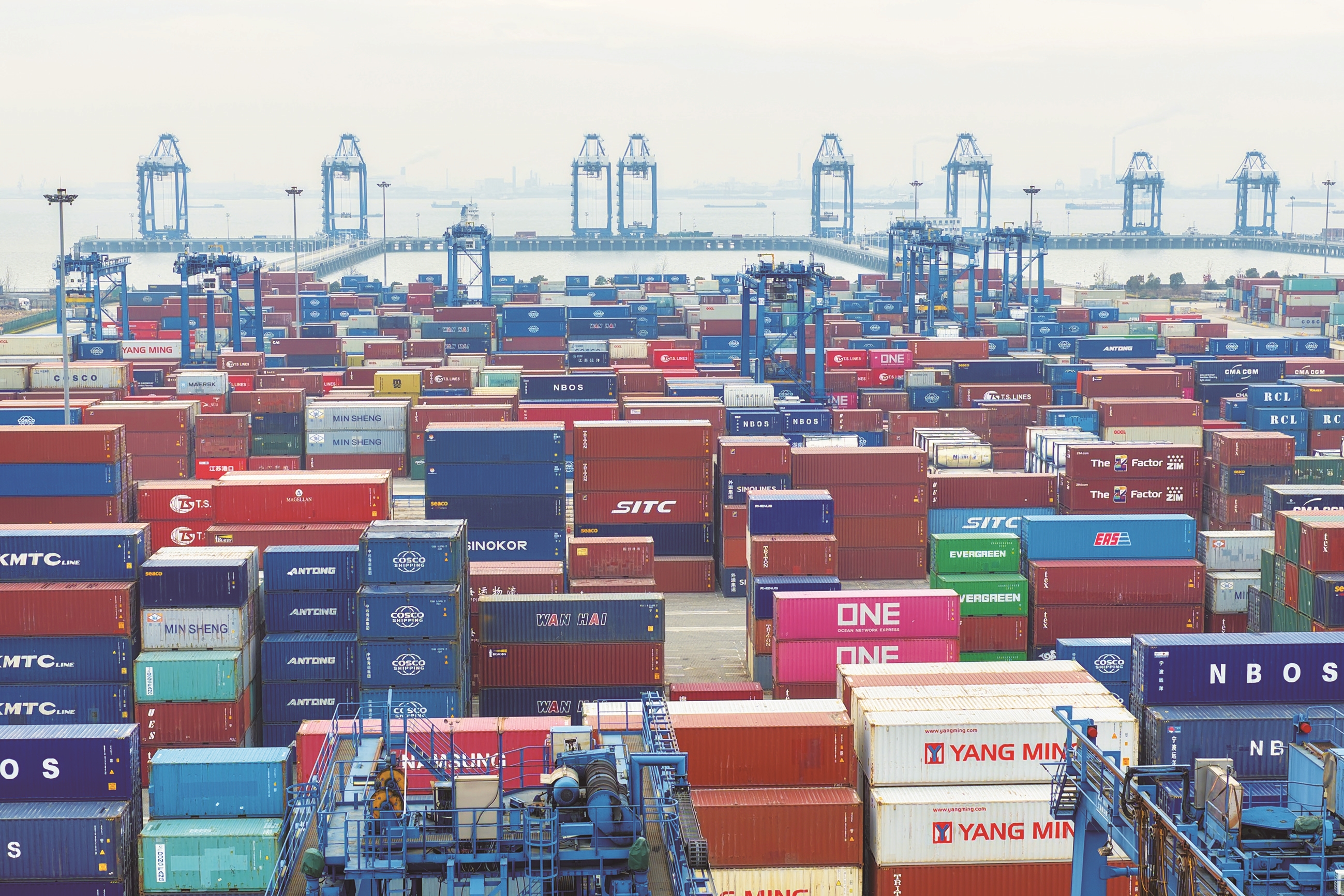 昨天拍摄的南通港通海港区集装箱堆场和码头。2025年,南通港口完成集装箱吞吐量253万标箱,其中沿海、内河集装箱吞吐量同比增长32.5%、23.9%。 记者 许丛军摄