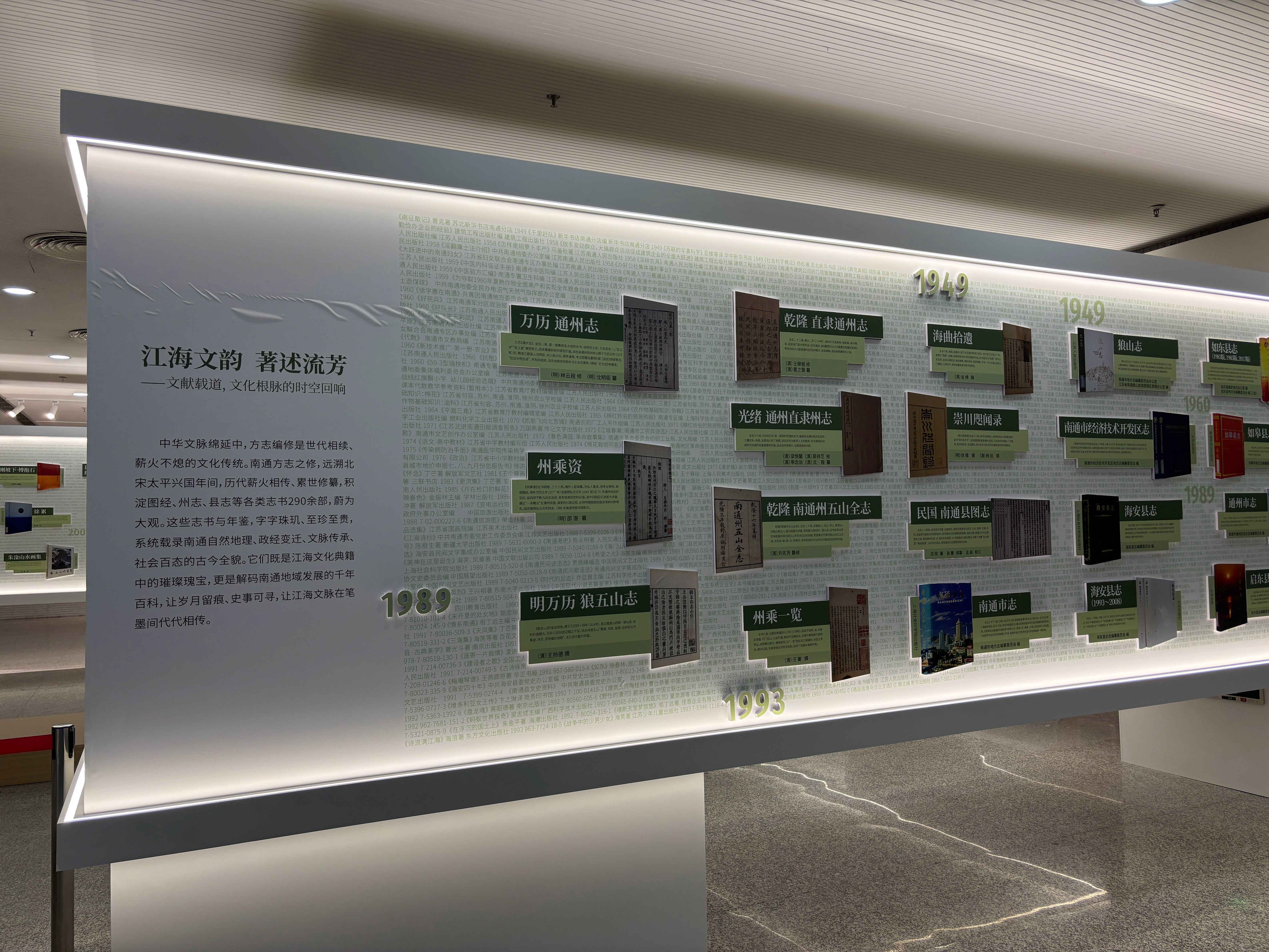 本次展览对图书馆馆藏5000余种地方文献数据进行梳理,提炼形成“江海文韵 著述流芳”“张謇实业 笔耕救国”“文学诗韵 人文叙事”“艺术创美 江海气派”“非遗传承 活态记录”“文旅奔赴 门户新篇”等11个主题板块。各板块精选近30种代表性文献,搭配简明提要,让观众一目了然,有的放矢地挑选自己感兴趣的书目深入阅读。