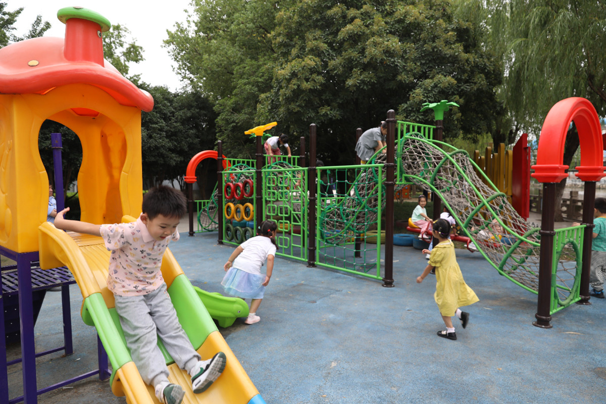 对居民顾剑虹来说,曾经每天最头疼的事就是带小孙女去哪儿转悠。如今,“幸福湾”城市党建主题公园成了她的“遛娃宝地”。公园里的亲子健身区域,既有适合大人的智慧健身区,也有专为孩子打造的“启慧园”儿童亲子乐园;沿河铺就的健康步道,满足了不同年龄段居民的运动需求。更贴心的是,滨河驿前的智慧游戏区,不仅地面画着跳房子、安全大富翁等趣味游戏,还摆放着象棋、围棋、飞行棋等棋类道具,孩子们在这里撒欢玩耍,家长们也能安心歇脚,欢声笑语洒满了整座公园。