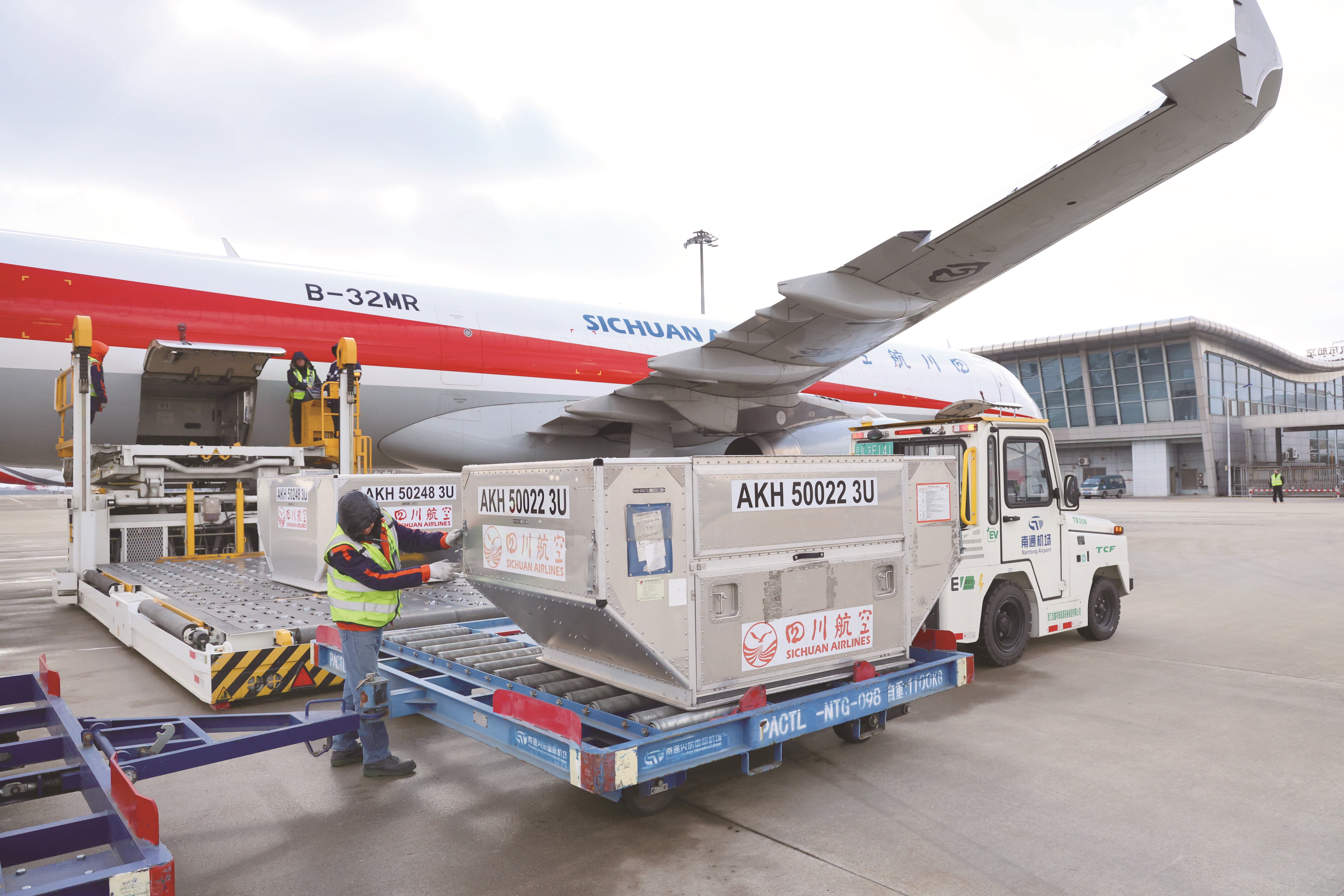 中午12时43分,一架四川航空A321F全货机降落在南通机场停机坪上,机场工作人员有条不紊地开展指挥、对接、开舱、卸载等工作(右图 记者 许丛军摄)。一批应用于电子信息、航空航天、能源和生命医学等领域的聚合物材料经南通机场实现整板直转,将搭乘大阪—南通—成都国际联程航班运往成都。