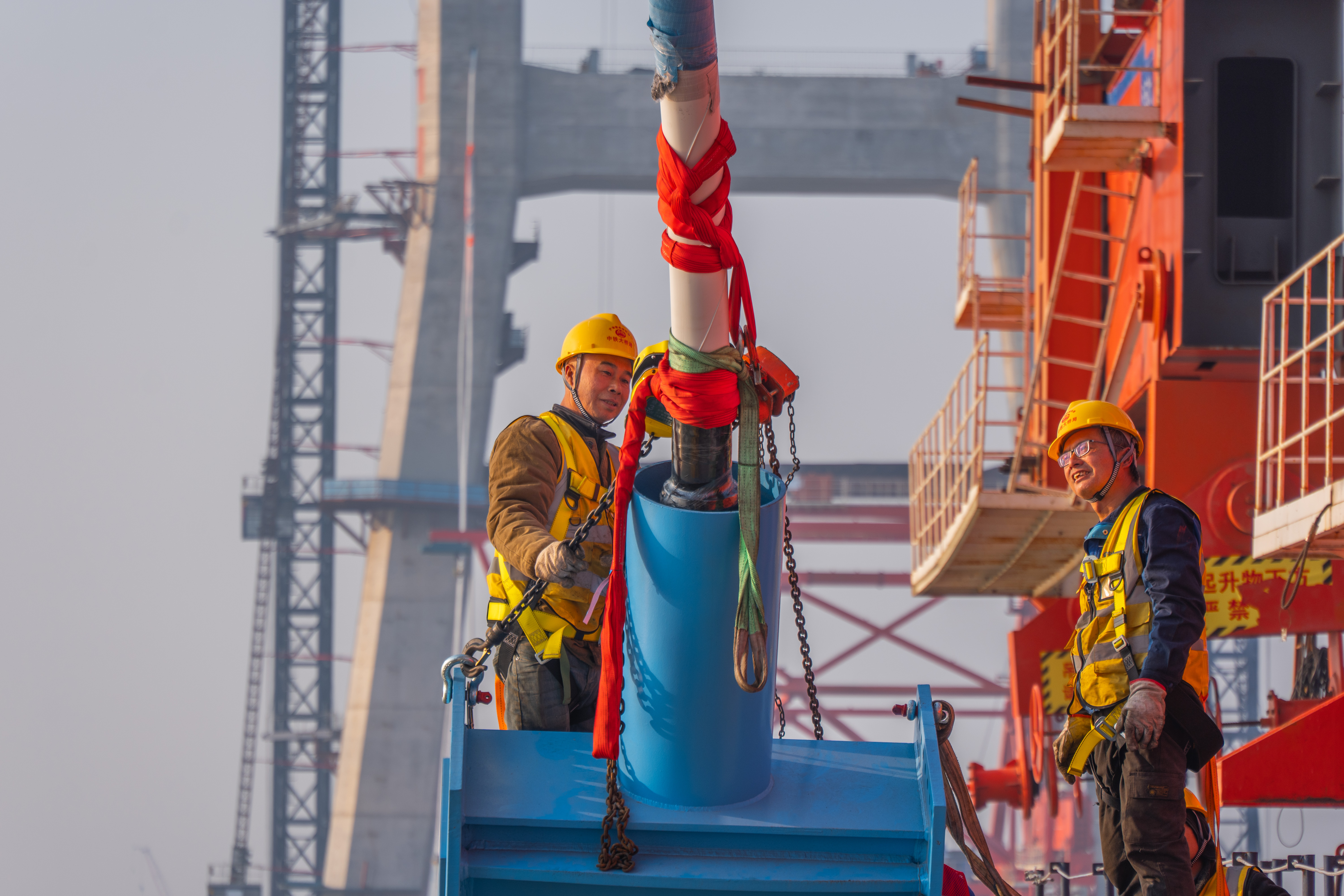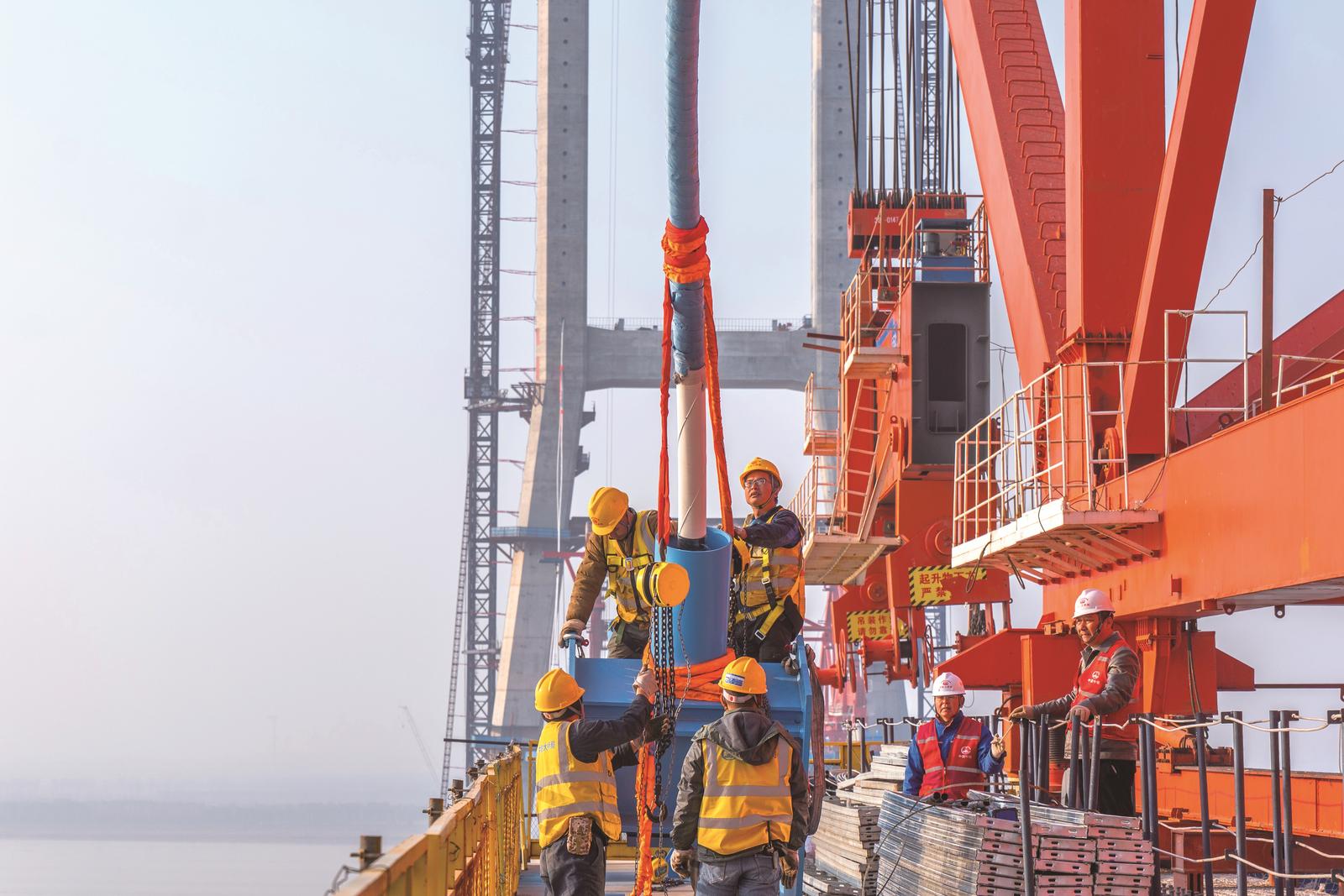 近日,由中铁大桥局承建的崇启公铁长江大桥4号主塔首对斜拉索成功挂设,标志着主桥斜拉索安装施工正式拉开帷幕。据介绍,崇启公铁长江大桥主桥斜拉索采用的是直径7毫米的平行钢丝拉索,斜拉索标准抗拉强度达到2100兆帕,配合主梁两桁结构,拉索采用双索面布置。预计4月底主塔挂索施工完成,5月底实现主桥合龙。