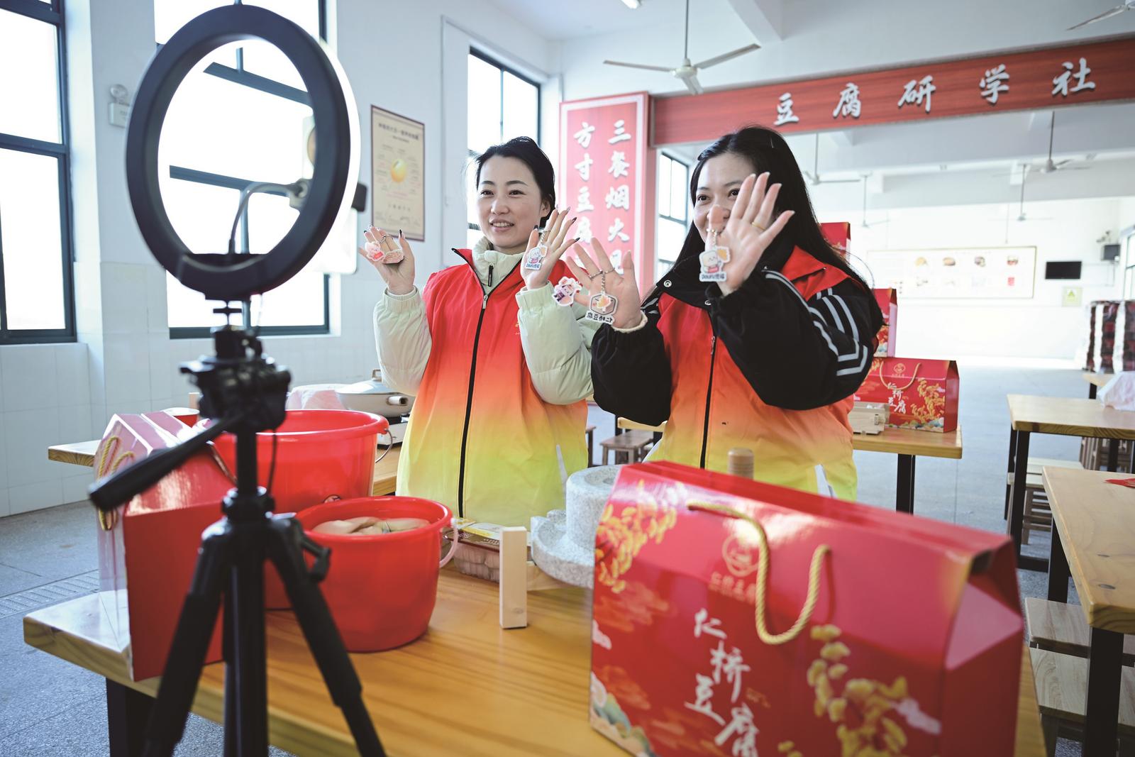 昨天,海安孙庄街道祖师庙村“仁桥豆腐”坊里,青年党员干部通过直播平台为村里“小磨”豆腐打开新销路。近年来,海安因地制宜发展村级“共富工坊”,培育农产品加工、特色种养和轻工制造等多元业态,以手机为“新农具”,拓展直播销售渠道,助力群众增收、企业增效。 顾华夏摄