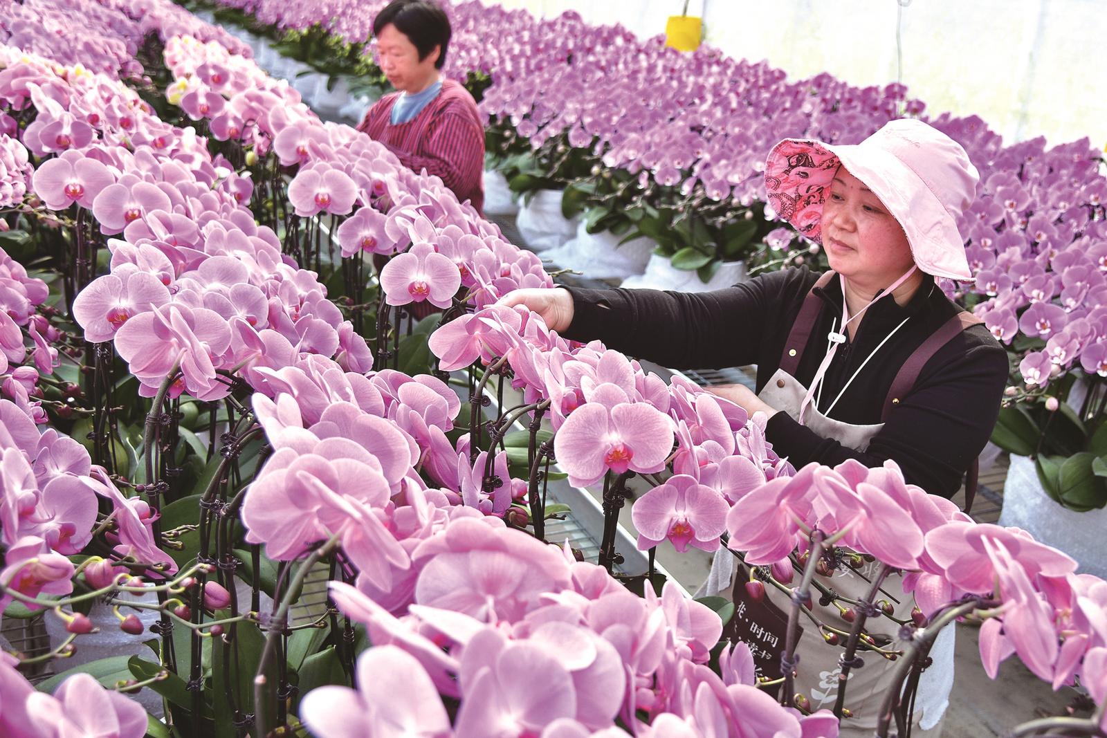 昨天,在如皋市如城街道大明社区保来园艺花卉基地,花农在打理蝴蝶兰。