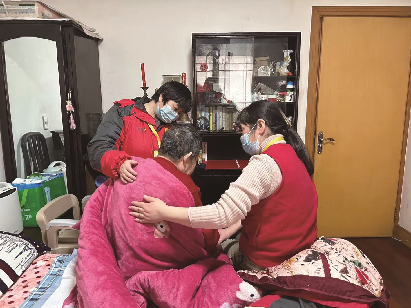 长护师王华(左)和季彤给高秀珍老人拍嗝。 朱颖亮